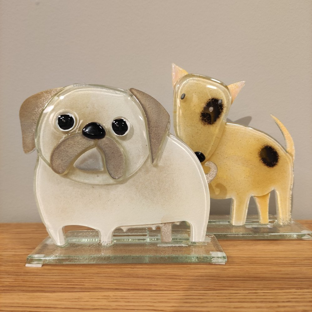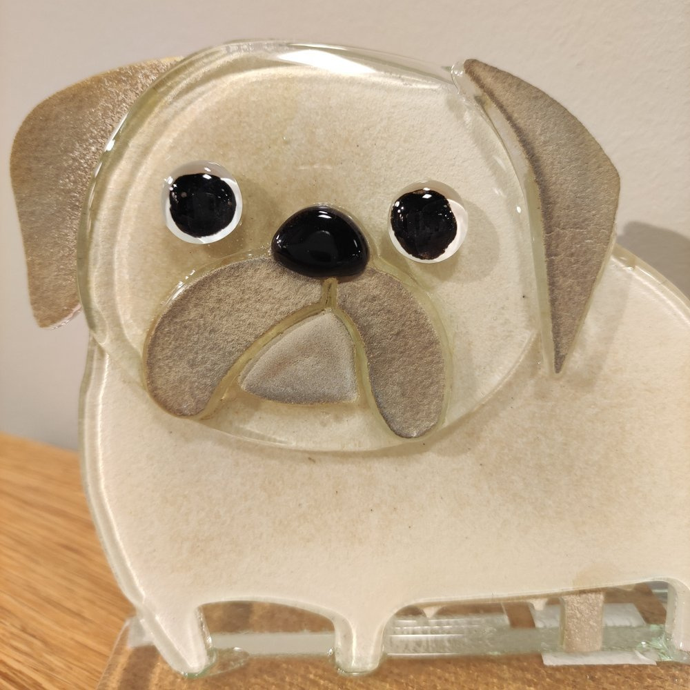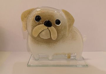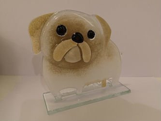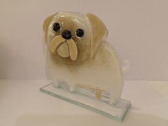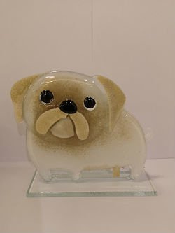 • Szklana figurka- mops . Kolorystyka biało-brązowa., czarne oczy i nos. Wykonany ręcznie w technice fusingu.