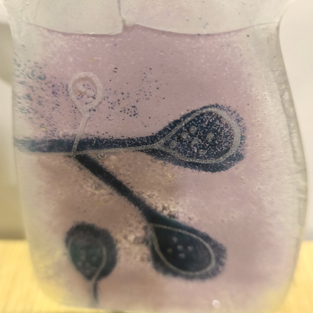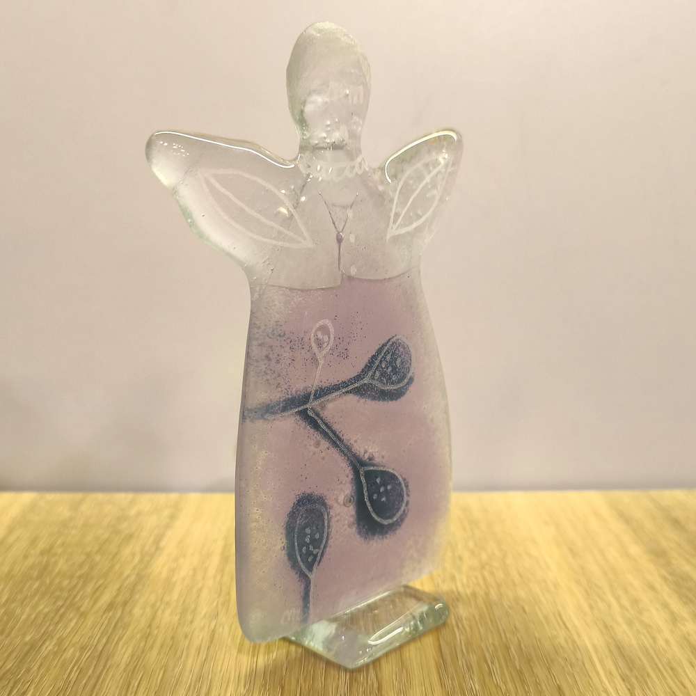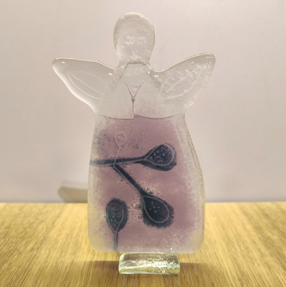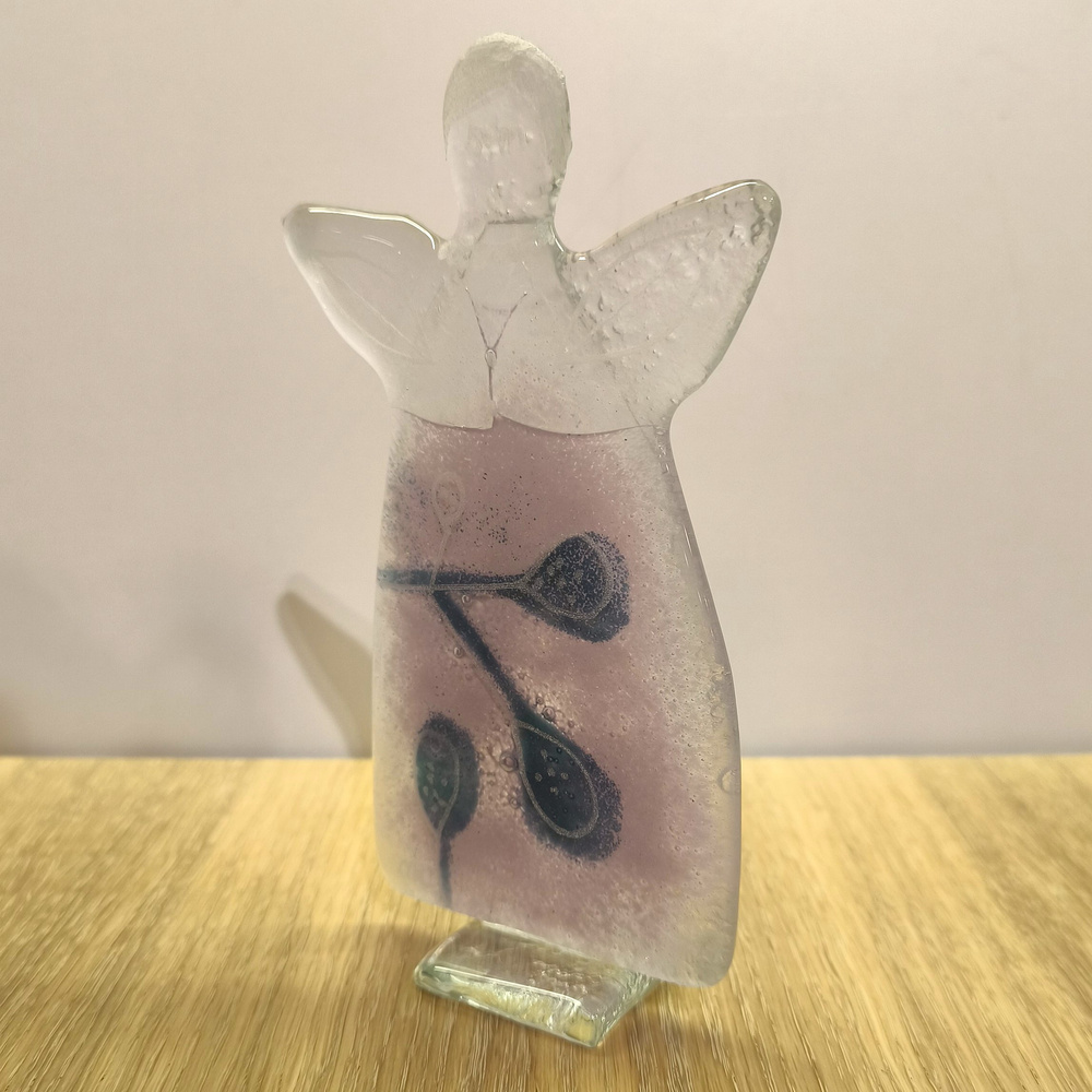 - Szklany aniołek wykonany ręcznie w technice fiusingu. Kolorystka wrzosowa z fioletową gałązkami. Wielkość: