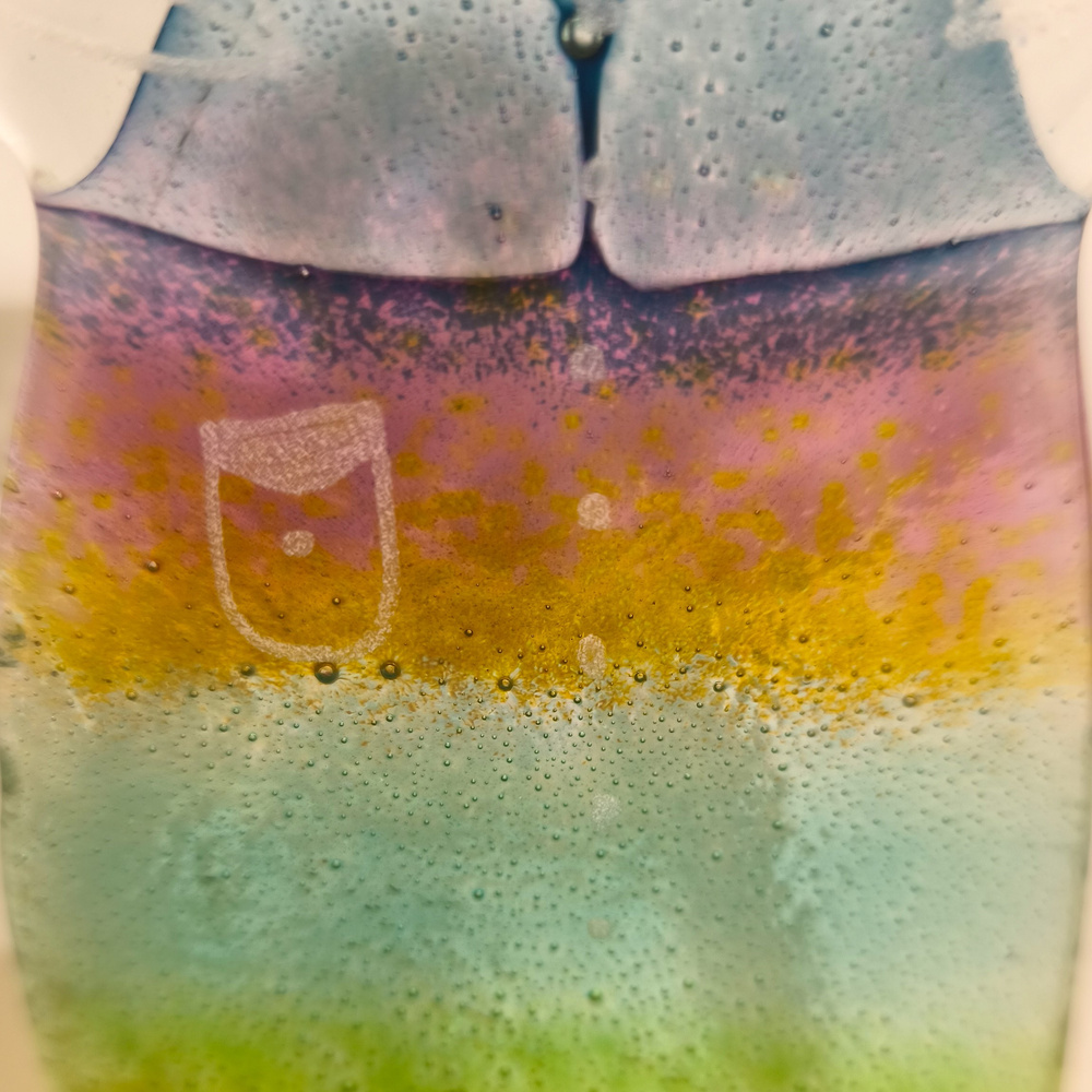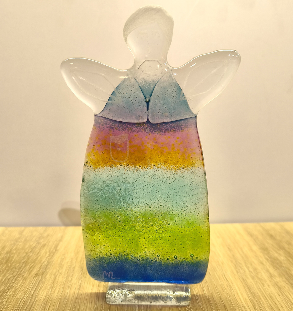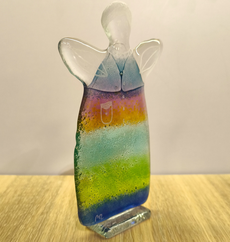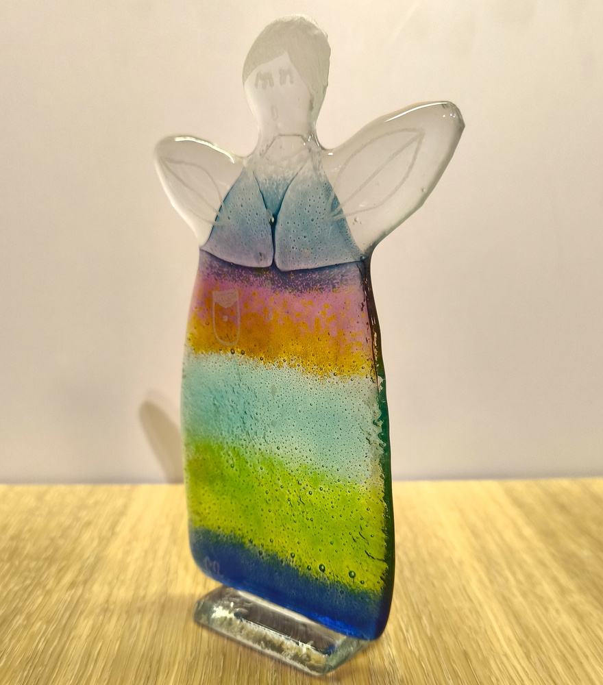 - Szklany aniołek wykonany ręcznie w technice fiusingu. Kolorystka seledyn , pomarańcz, błękit.