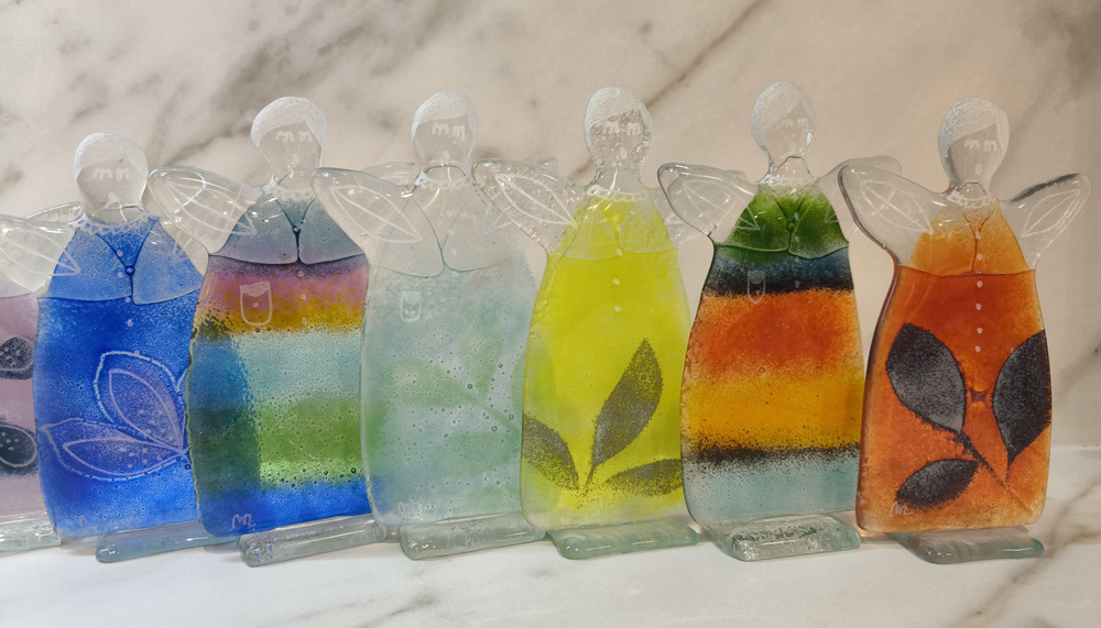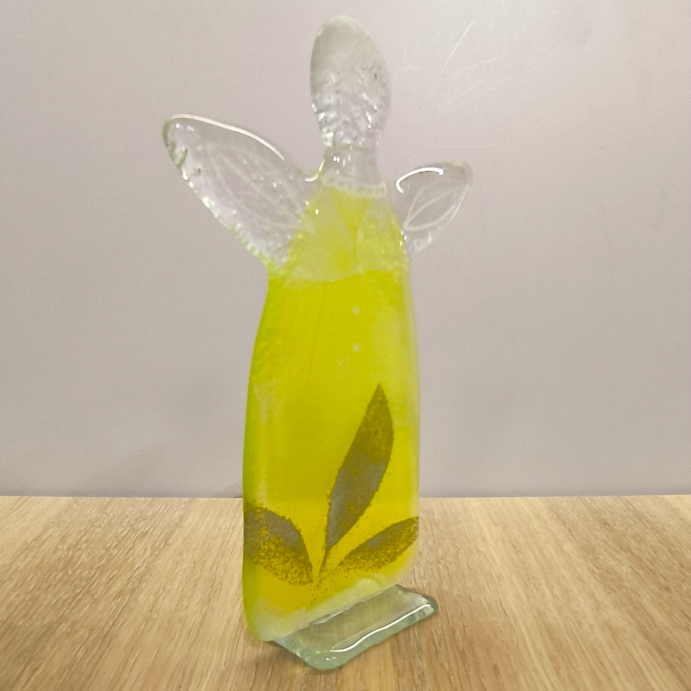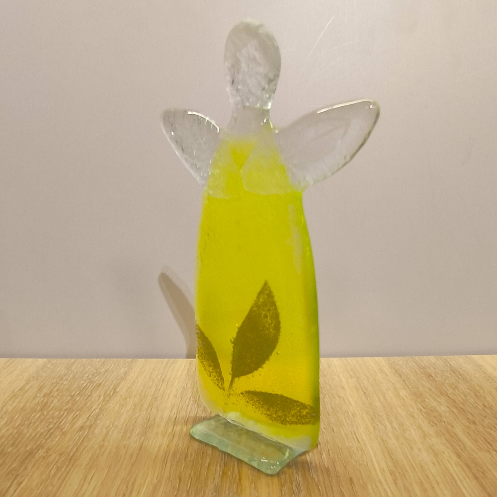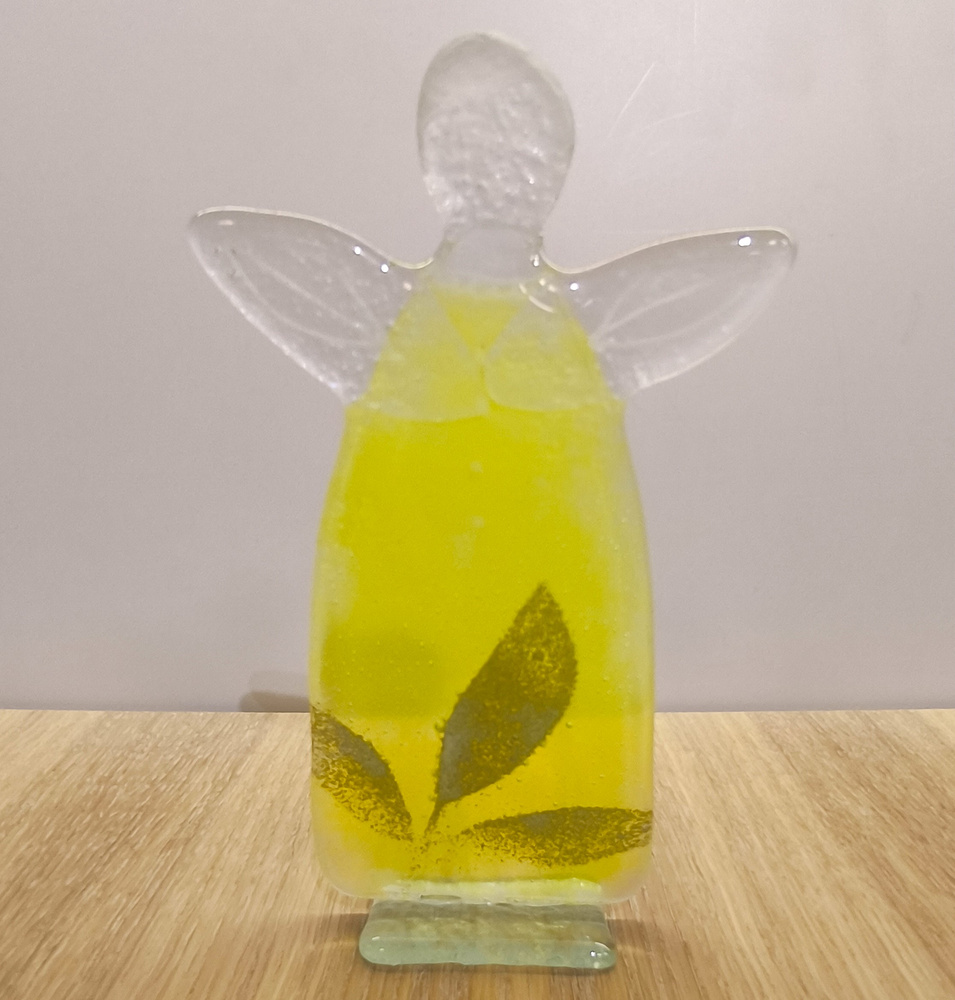- Szklany aniołek wykonany ręcznie w technice fiusingu. Kolorystka limonkowa z zieloną gałązkami . Wielkość: