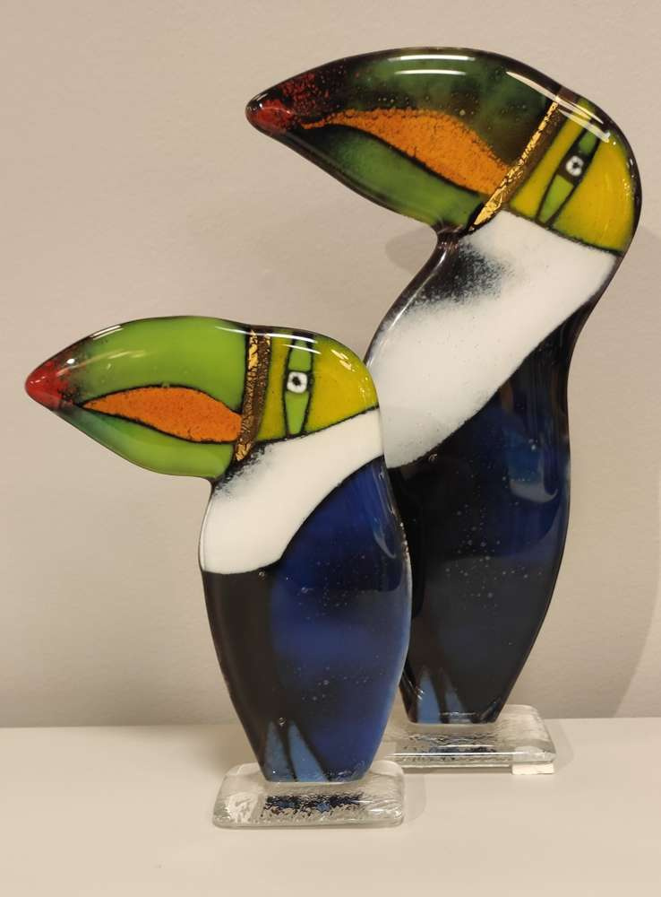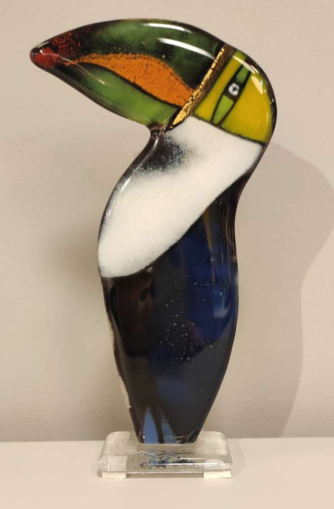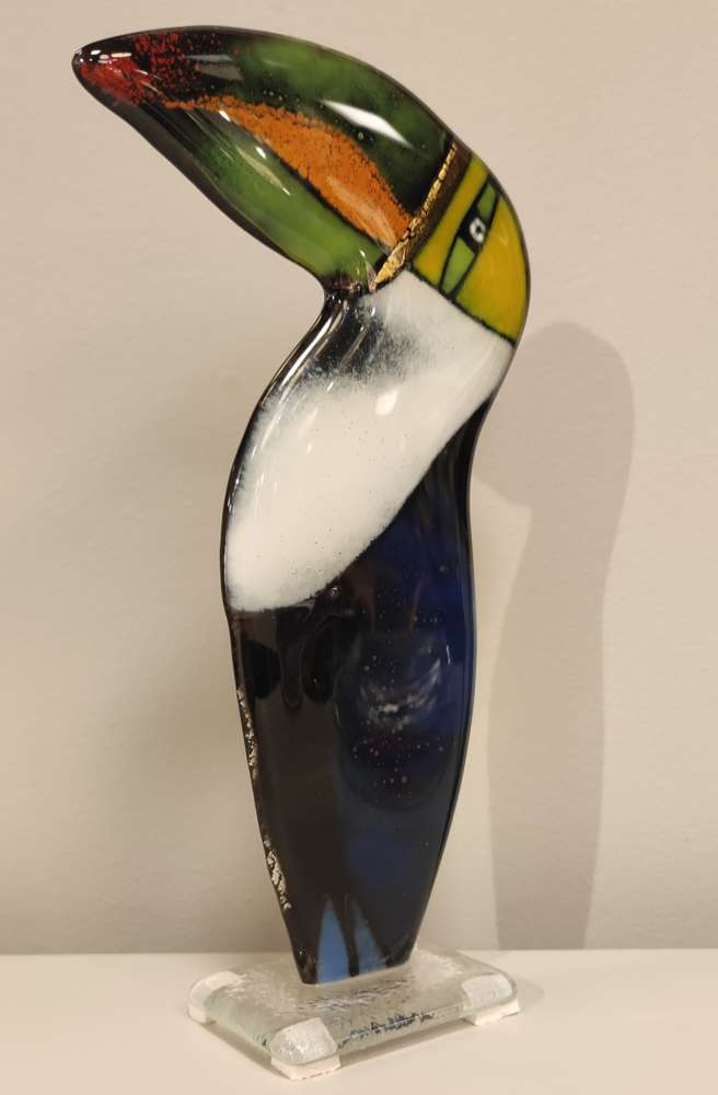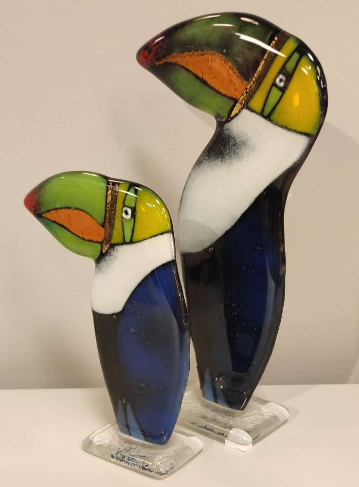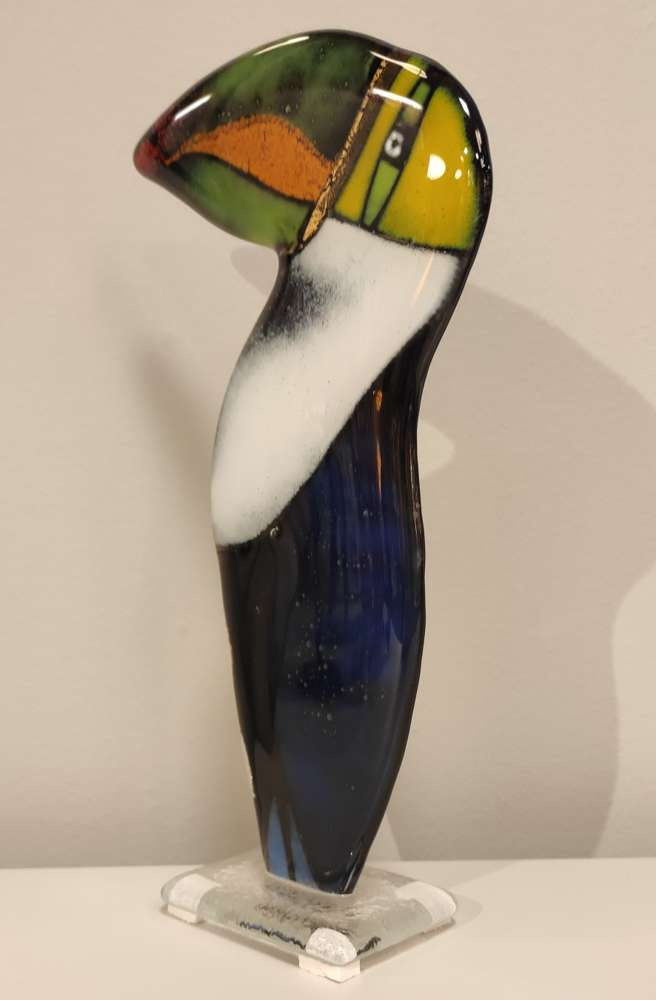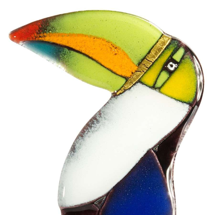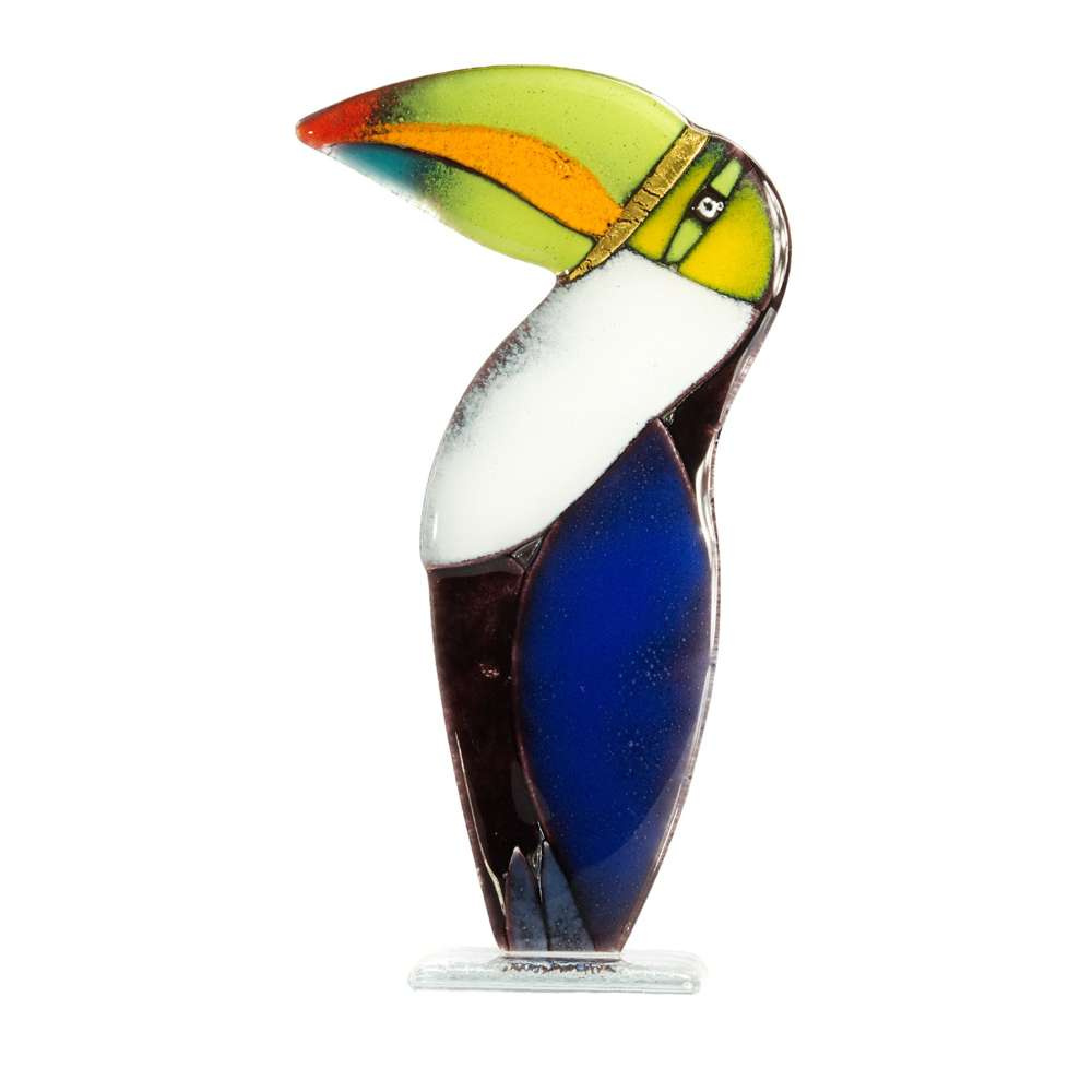Szklana figurka wykonana ręcznie w małej rodzinnej hucie szkła w Krośnie. Niezwykle piękna, dopracowana technologicznie i kolorystycznie. Podrasowana płatami złota. Granatowy tułów z białym kołnierzem i zielonym dziobem. Możliwość połączenia z tukanem z serii o mniejszym rozmiarze lub z tukanem o innym kolorze dzioba. Idealna na oryginalny prezent dla miłośników pięknych, unikatowych przedmiotów. Może przysiąść na parapecie , półce czy podświetlonej witrynce. Posiada stabilną, okrągła szklaną podstawę łączona klejem bezbarwnym utrwalanym na ultrafiolet. Możliwość stworzenia kolekcji szklanych stworzeń z tej samej pracowni np. z kameleonem , żabą czy misiem. Wielkość szer. 14 cm, wys. 23 cm, gł. 6,5 cm.Kolor