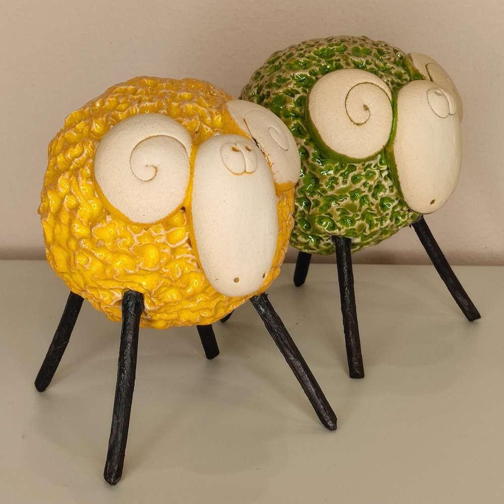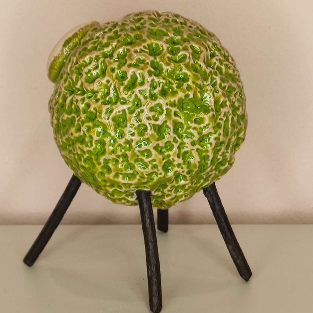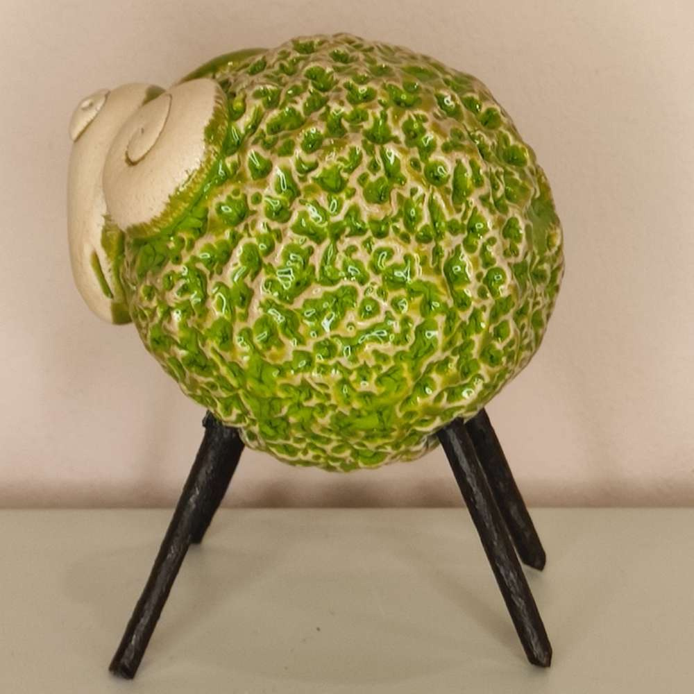 - Figurka ceramiczna - baranek, szkliwiona w kolorze zielonym , z naturalnym szamotowym pyskiem i rogami. Czarne metalowe nogi.