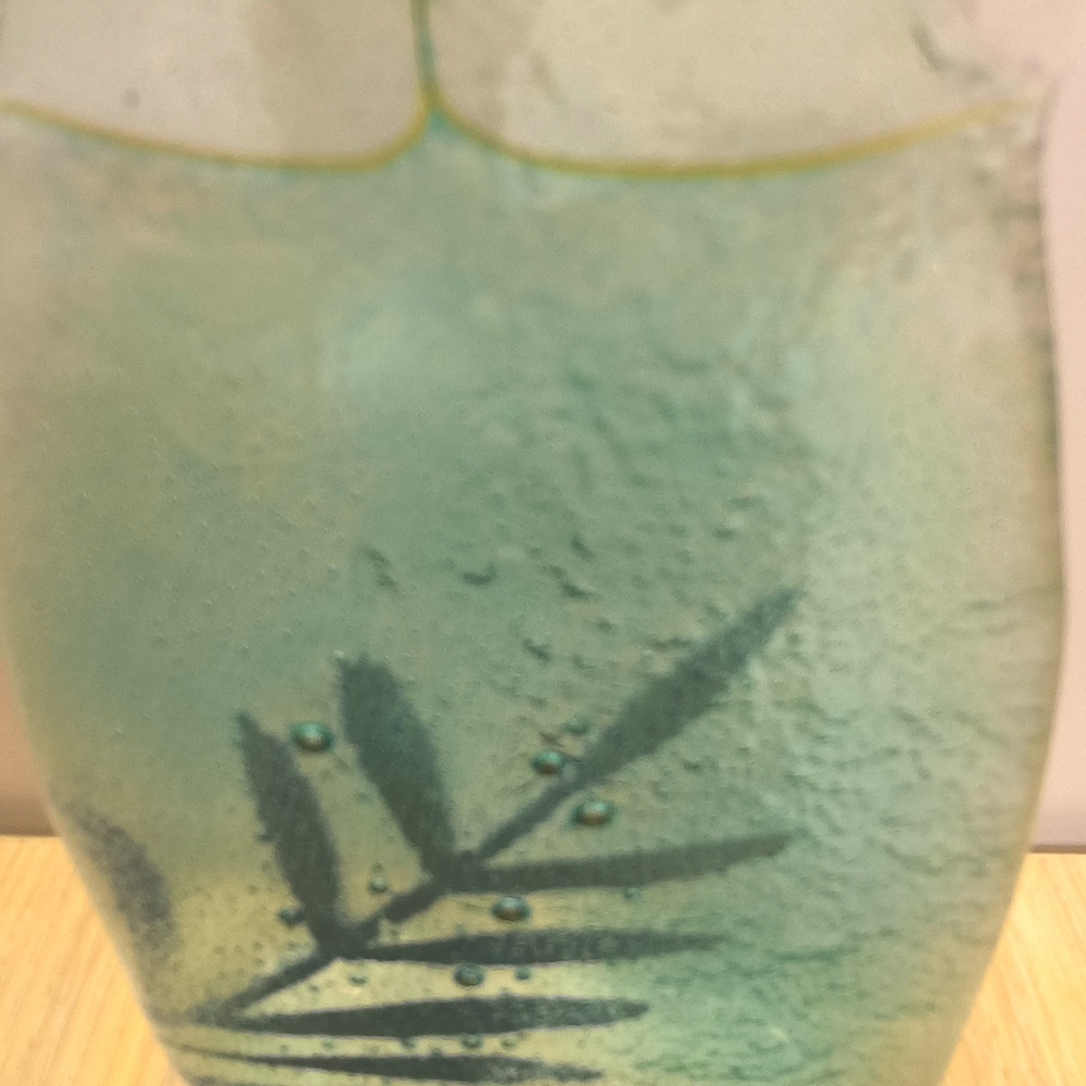 Wyrób ręczny, artystyczny, autorstwa polskiej artystki, absolwentki wrocławskiej ASP. Kolorystyka błękitna sukienka z dekorem w postaci zielonej gałązki , wykończona ręcznym grawerunkiem na twarzy i skrzydełkach, z dodatkową dekoracją w postaci czerwonego serca. Doskonale prezentuje się w oknie( na parapecie ) lub w miejscu z dobrym oświetleniem, które pokazuje cały czar i charakter szkła. Można skompletować z innym aniołkiem z serii lub figurkami reniferka lub mikołaja. Idealny prezent dla kolekcjonera aniołków. Wielkość szer. 11 cm, wys. 16 cm, gł. 3 cm.
