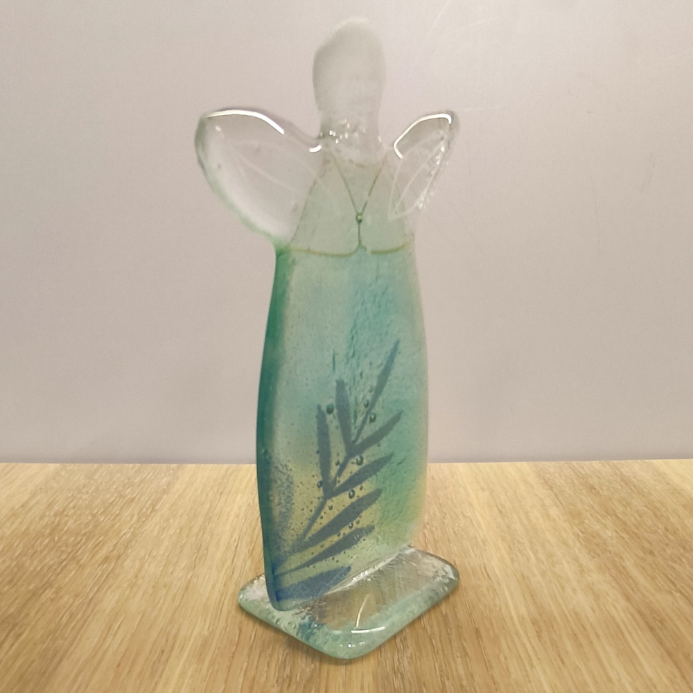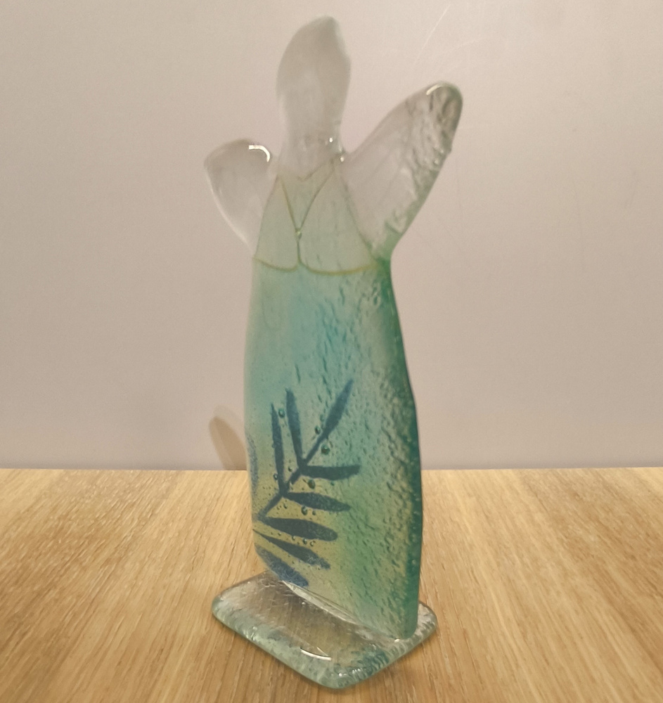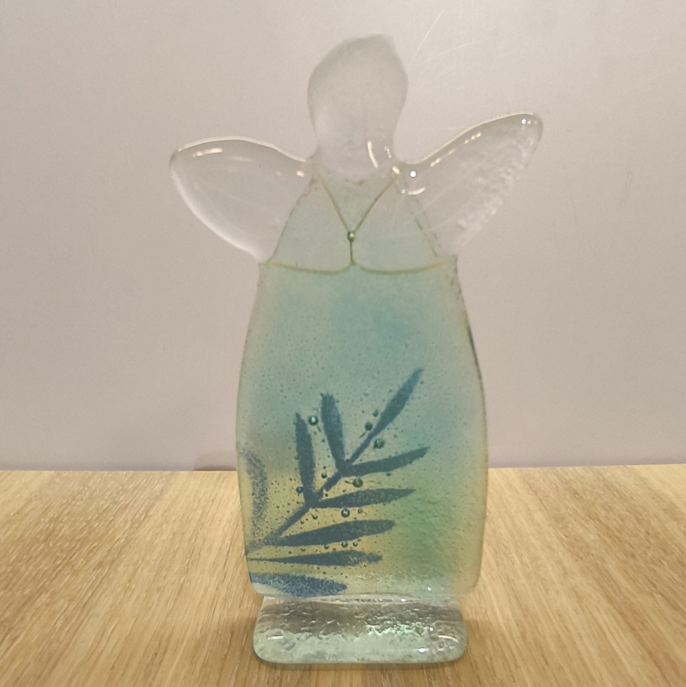- Szklany aniołek wykonany ręcznie w technice fiusingu. Kolorystka błękitna sukienka z dekorem zielonej gałązki,