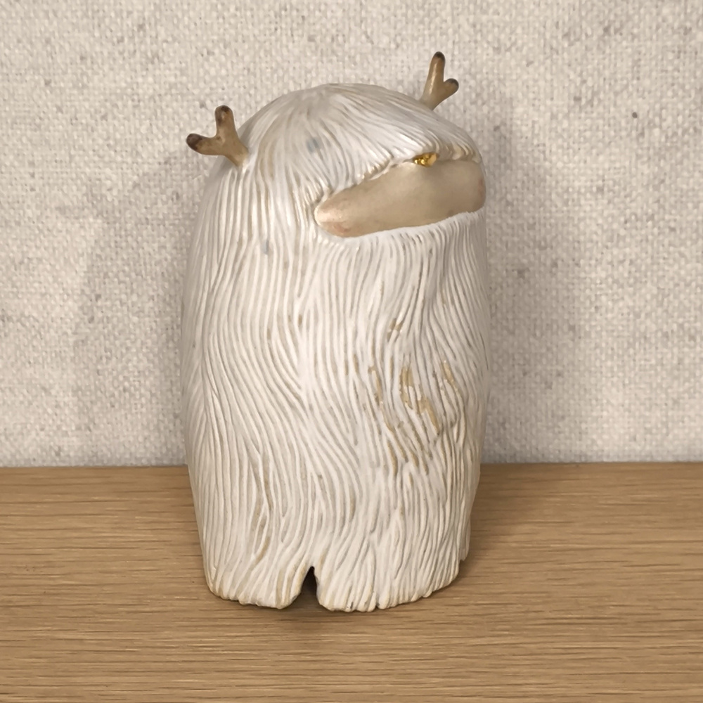 - Ceramiczna figurka przedstawiająca jelonka. Kolor biały szkliwiony, bużka w kolorze naturalnej gliny. Nosek złoty.