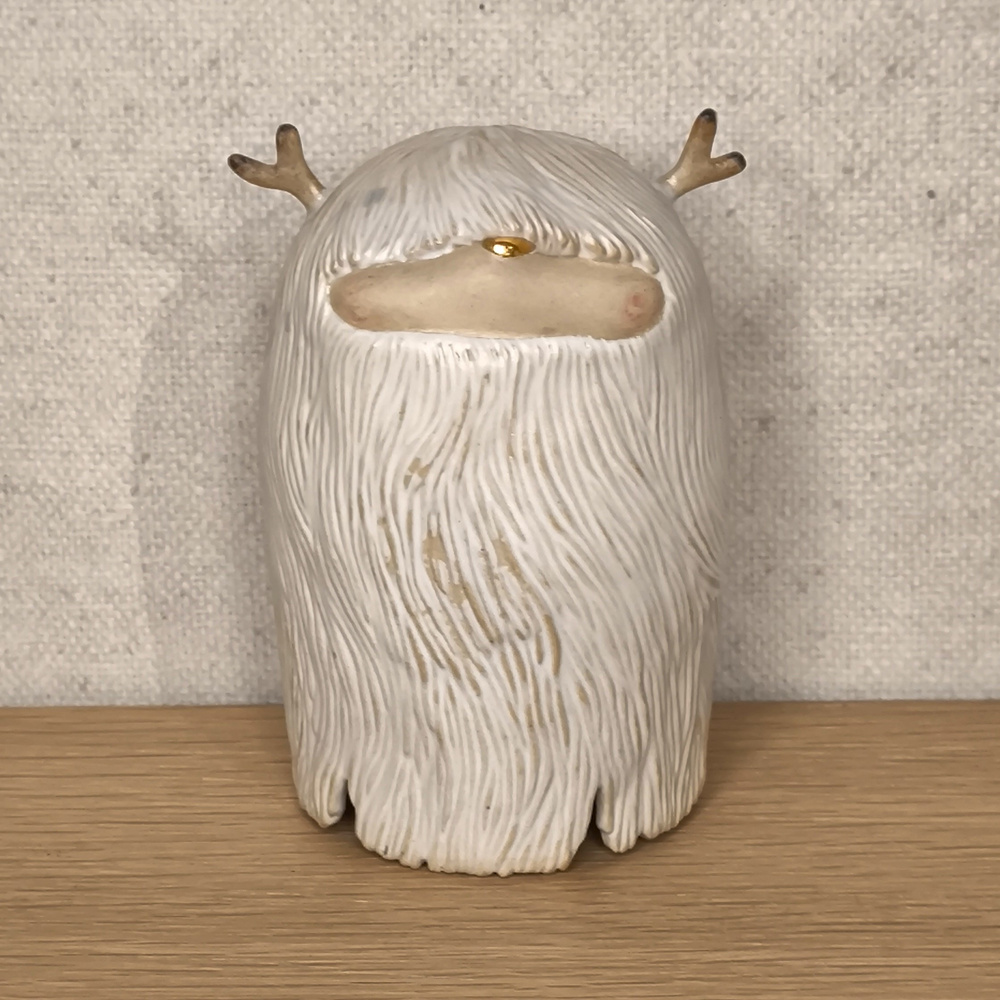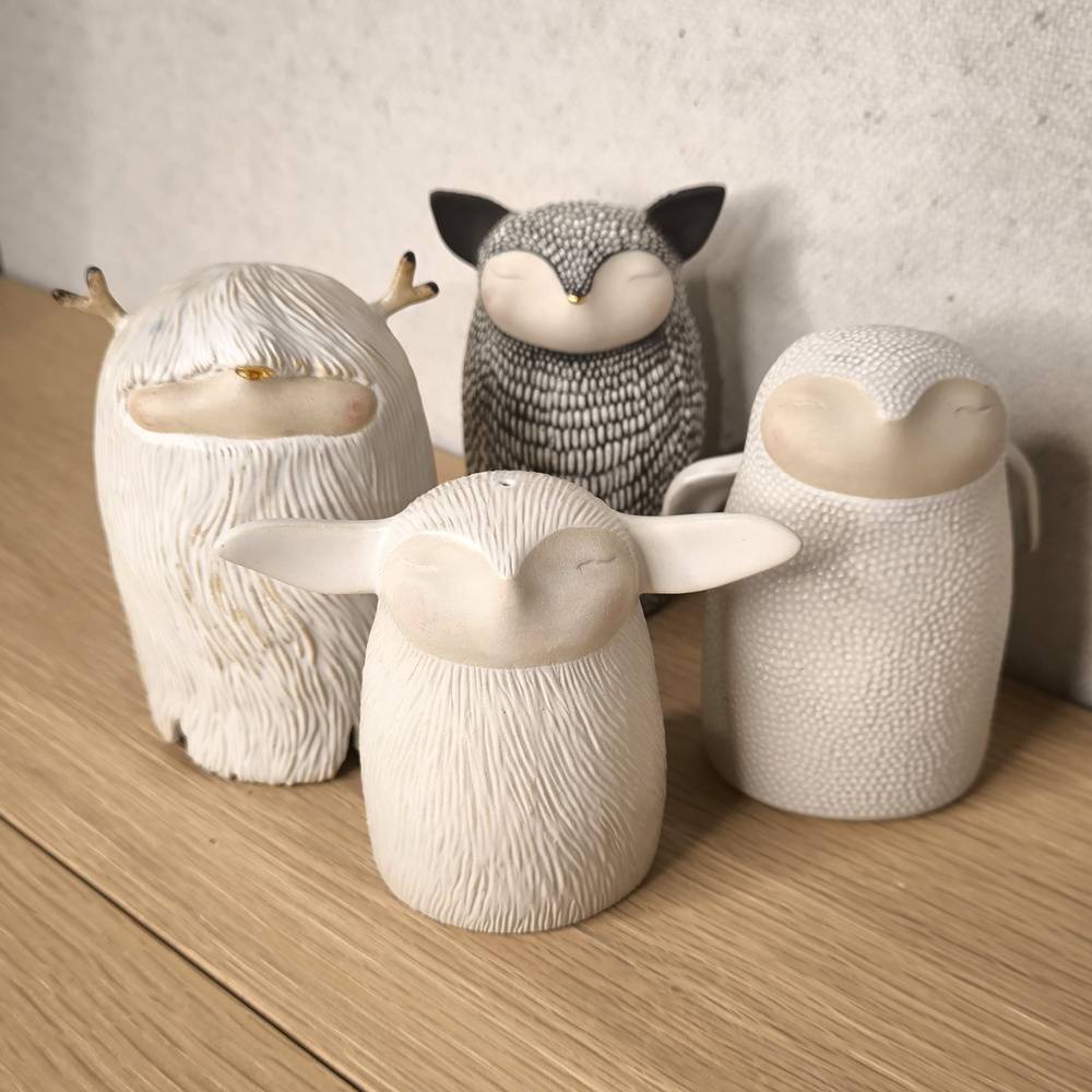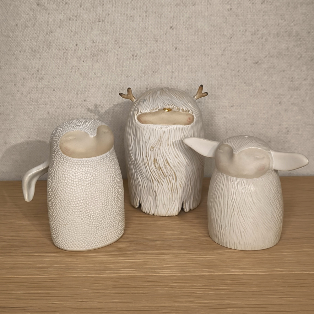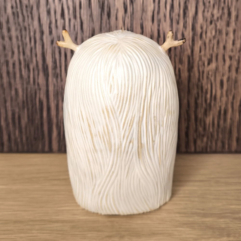 Urocza figurka przedstawiająca jelonka wykonana z gliny. Kolorystyka ceramiki biała szkliwiona na połysk tylko bużka matowa w kolorze naturalnej gliny. Małe delikatne różki. Istniej również wersja szara strukturalna matowa. Możliwość skompletowania z innymi kompanami z serii owieczką , kotkiem czy łosiem. Figurka wykonana ręcznie w małej polskiej manufakturze ceramiki z olbrzymim przekazem emocji, pięknem detalu i dbałością o estetykę. Produkt unikatowy, każdy egzemplarz będzie się trochę różnił od poprzedniego. Wymiary wys. 12 cm/ szer. 8 cm/ gł. 6 cm.