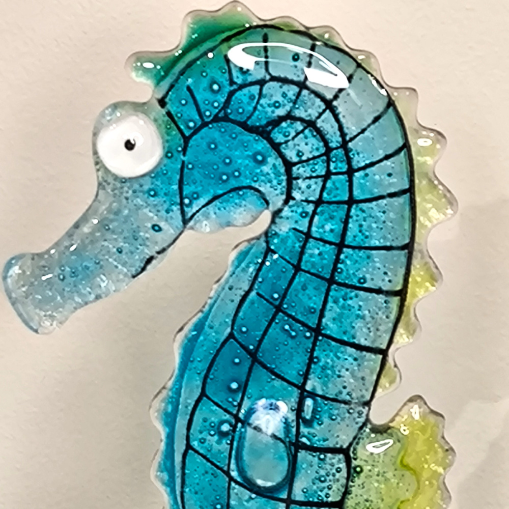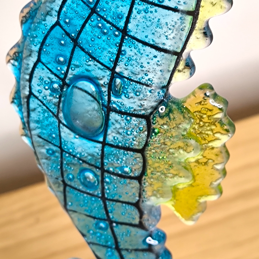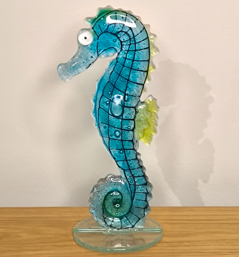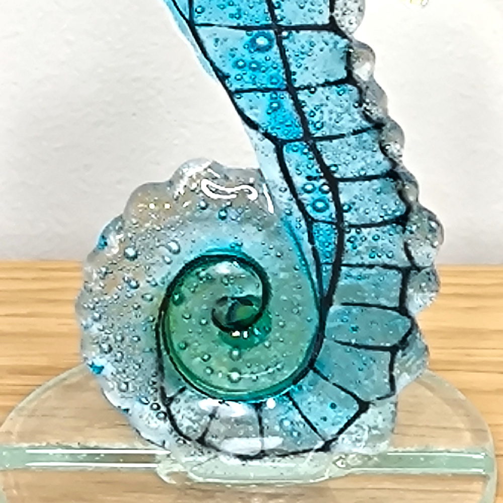 - Szklany konik morski w kolorze turkusowym na szklanej podstawce wykonany w technice fusingu.