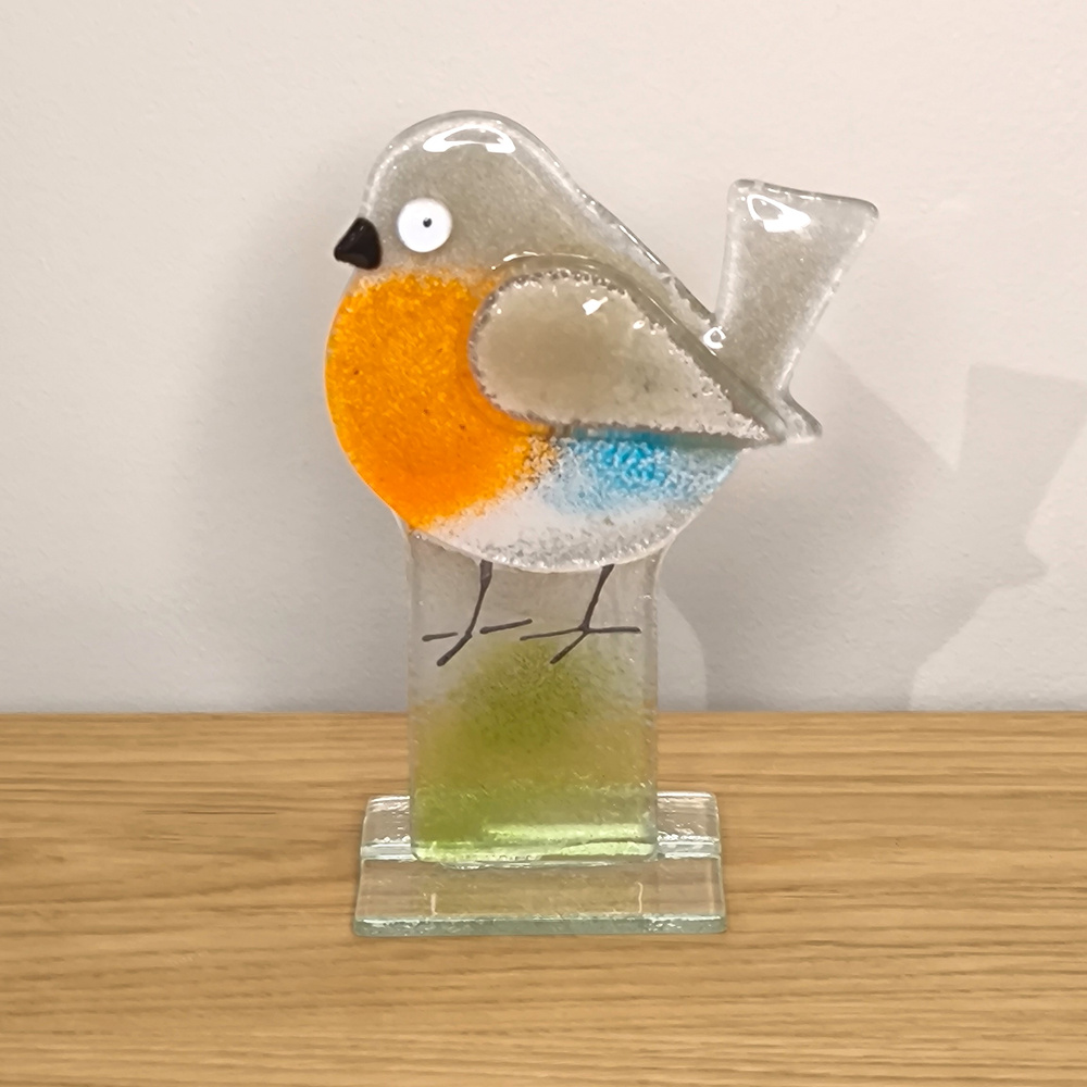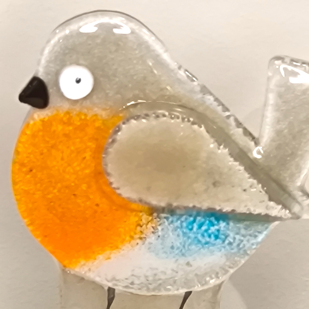 - Szklana figurka- wróbelek. Kolorystyka pomarańczowo-niebiesko-zielona z czarnym dziobem przeżroczysta podstawa. Wykonany w technice fusingu.