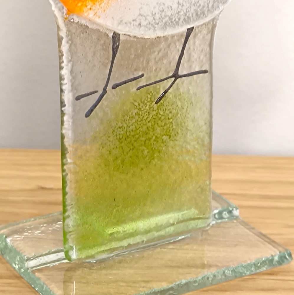 Szklana figurka przedstawiająca wróbelka w pomarańczowo-niebiesko-zielonej kolorystyce z czarnym dziobem i z przeżroczystą podstawą. Figurka płaska wykonana w technice fusingu klejona na szklanej stabilnej podstawie. Wykonana ręcznie w małej pracowni szkła artystycznego w Polsce. Sympatyczny pomysł na prezent lub atrakcyjną dekoracje domowych przestrzeni. Pięknie wyglądać będzie na półce, szafce czy parapecie w miejscu z podświetleniem. Można skompletować z kolegami z serii np. maskonurem/ flamingiem czy kaczuszką. Wielkość wysokość 16 cm, szerokość 10 cm , głębokość 4 cm.Kolor
