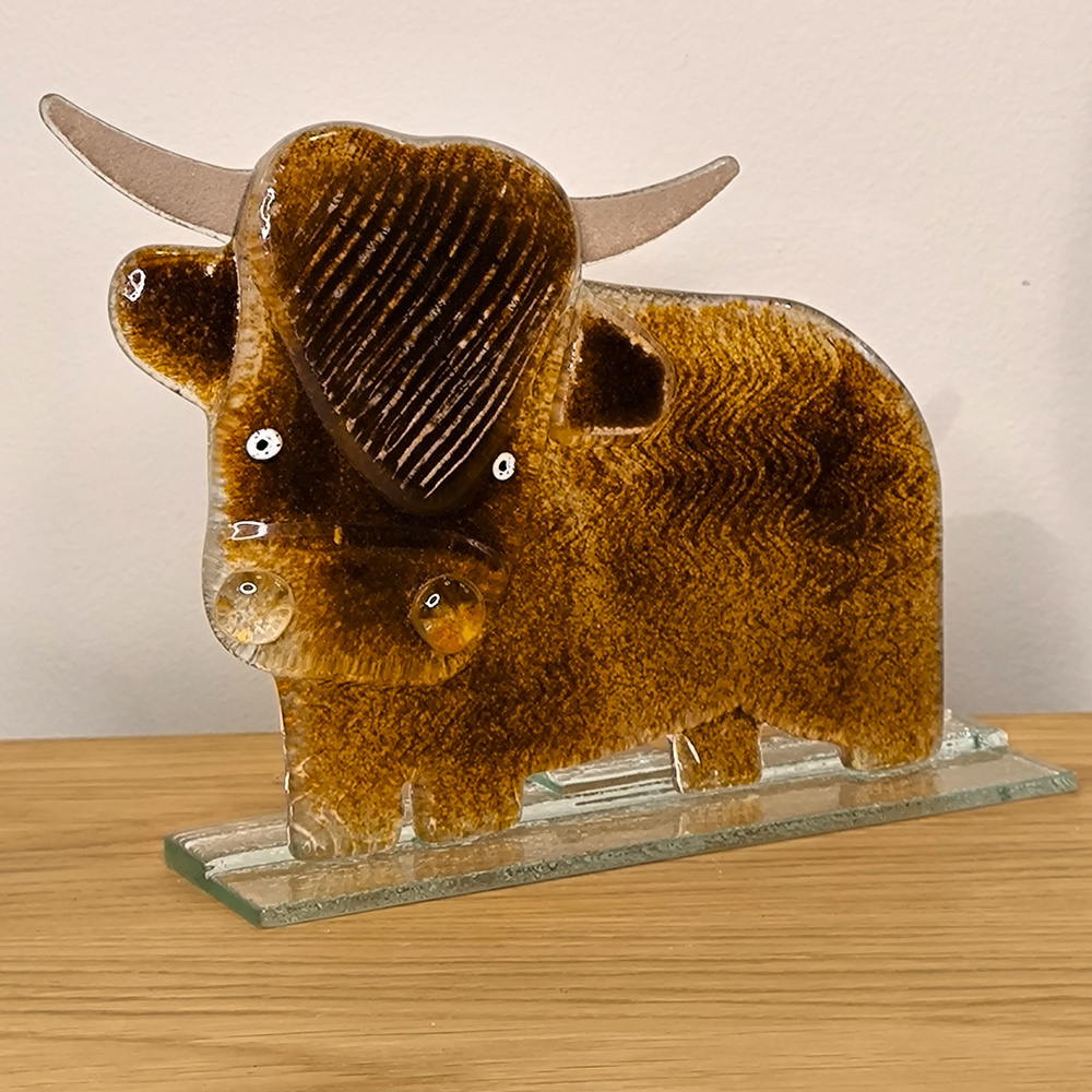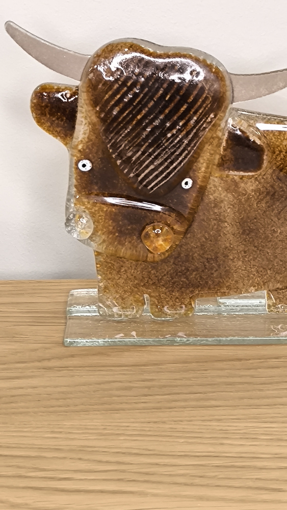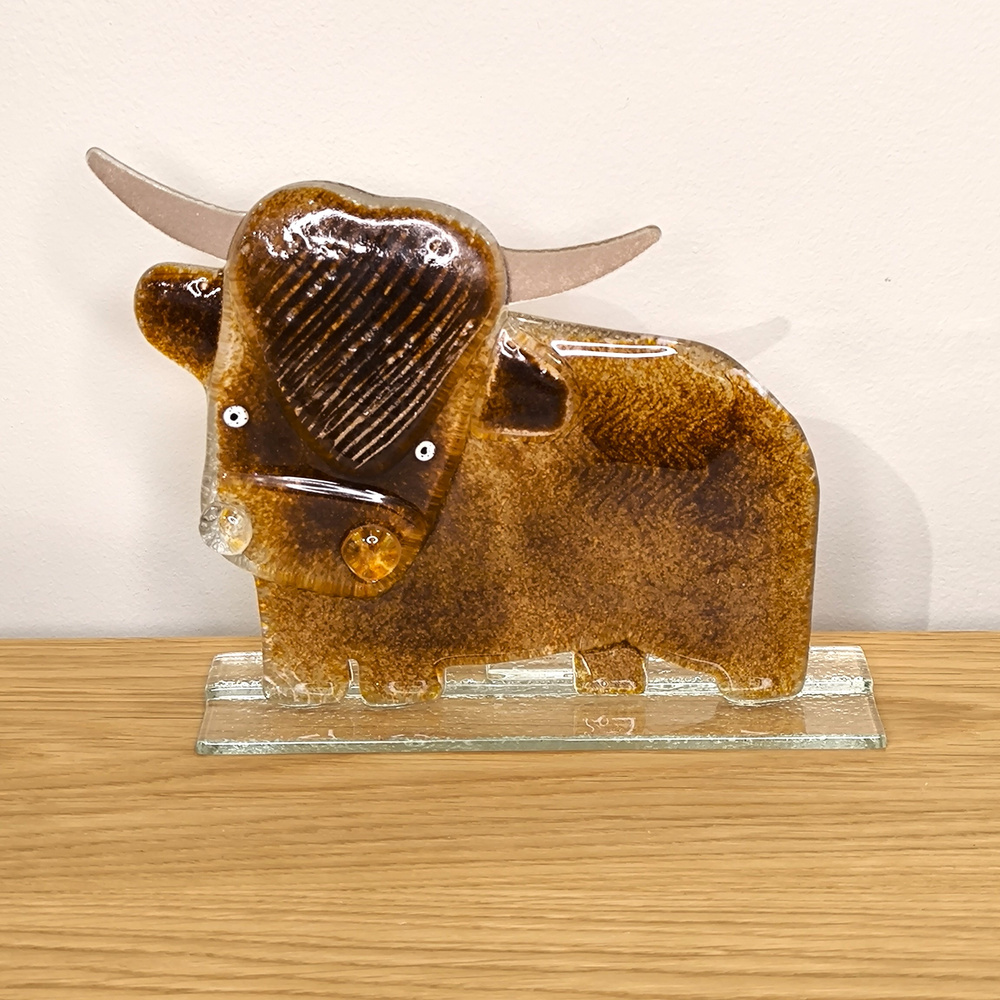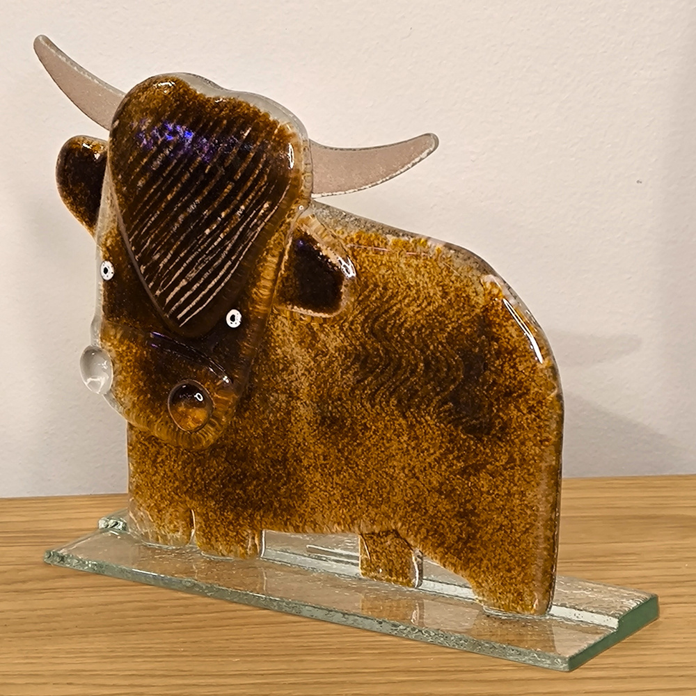 - Szklana figurka przedstawiająca żubra w brązowej kolorystyce. Wykonana ręcznie w technice fusingu.