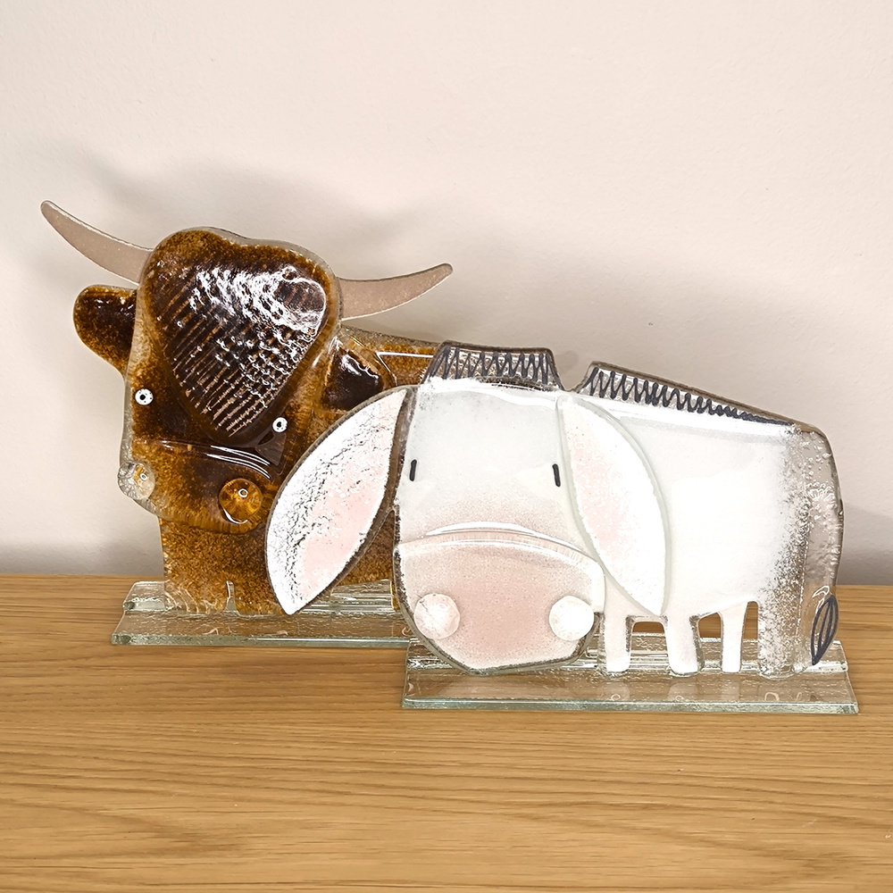 Szklana figurka przedstawiająca uroczego żubra w brązowej kolorystyce . Płaska na szklanej przeżroczystej stabilnej podstawie. Wykonany ręcznie w małej pracowni szkła artystycznego w Polsce w technice fusingu. Sympatyczny pomysł na prezent lub atrakcyjną dekoracje domowych przestrzeni. Pięknie wyglądać będzie na półce, szafce czy parapecie zwłaszcza podświetlony. Można skompletować z kolegami z serii osiołkiem , świńką, słonikiem, rybką, terierem, mopsem czy pitt-bulem. Wielkość 16 cm, szer. 20 cm , gł. 6 cm.