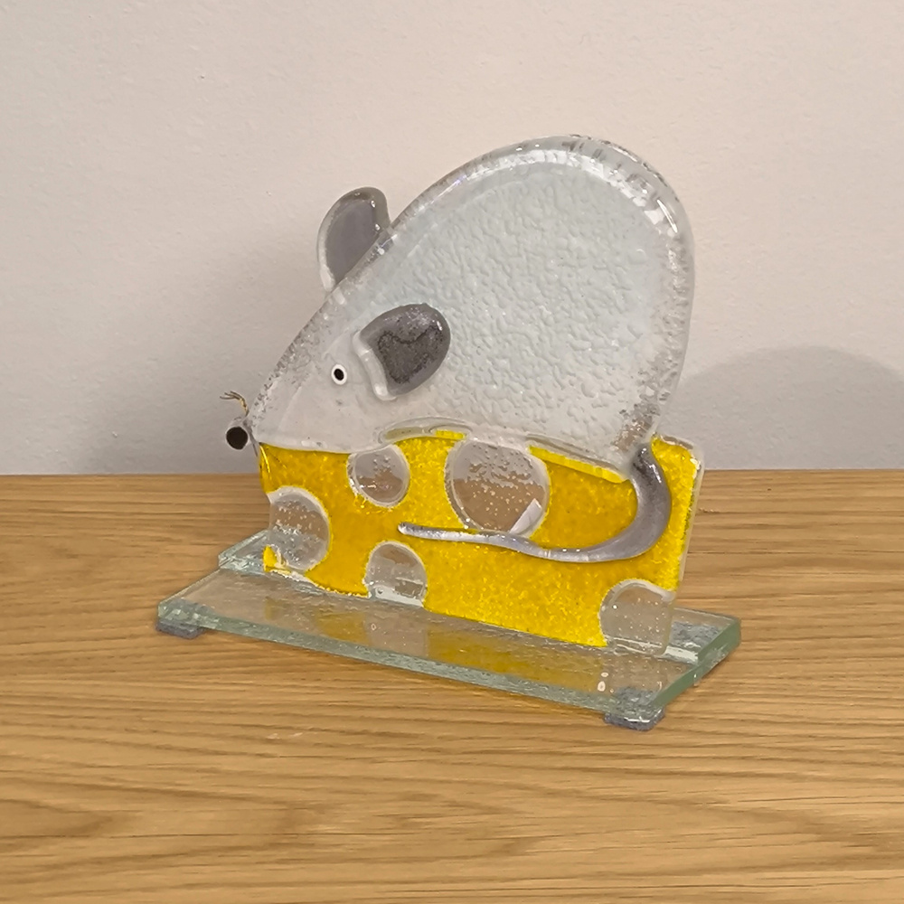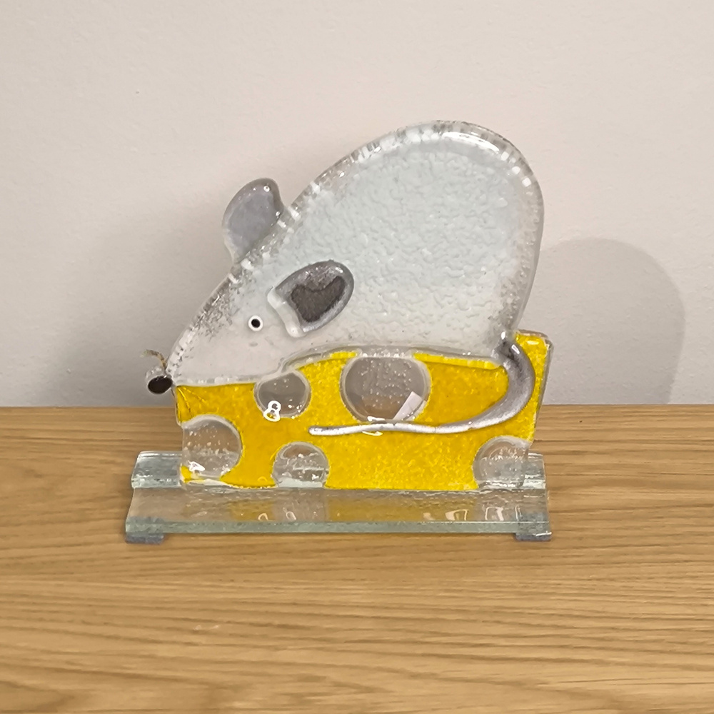 - Szklana barwiona na biały kolor figurka myszy siedzącej na żółtym serze. Zabawna forma. Technika fusingu.