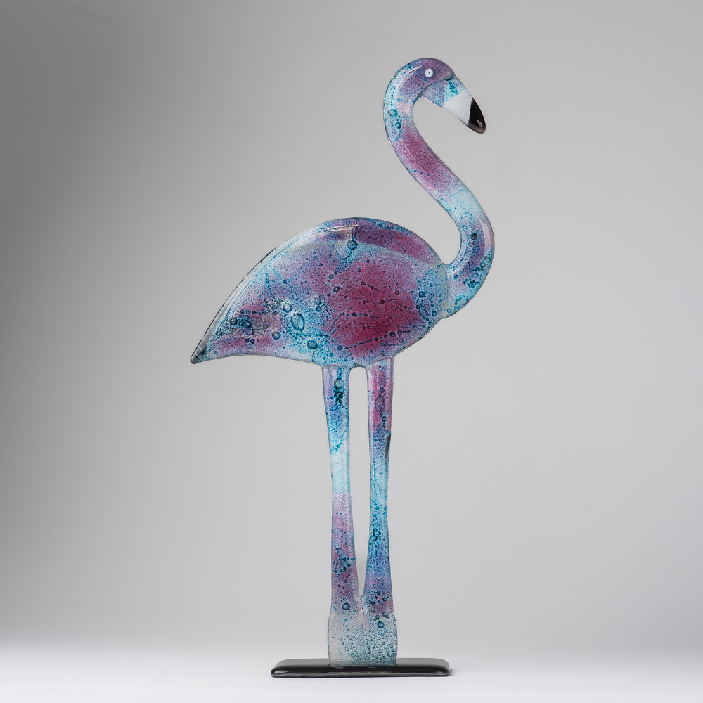- Szklana figurka przedstawiająca flaminga w niebiesko-fioletowej kolorystyce. Wykonana ręcznie w technice fusingu.