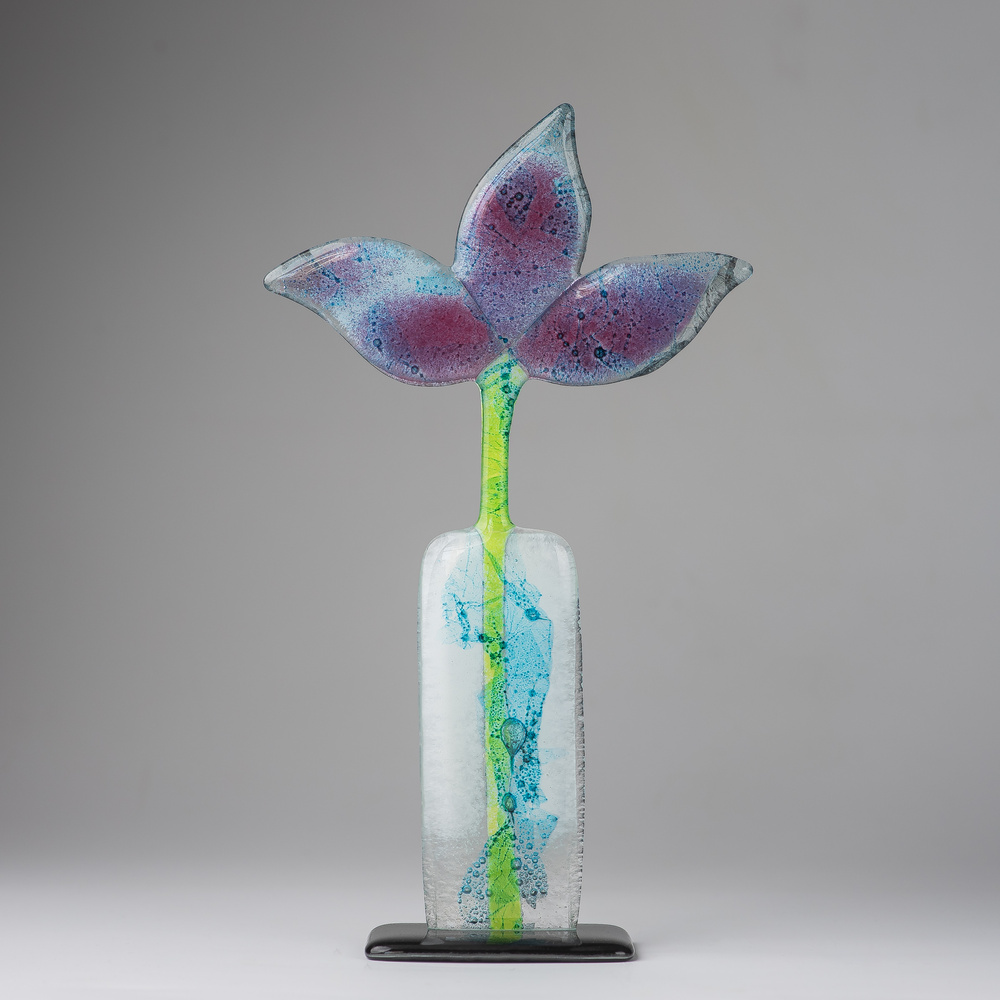 Szklana figurka w postaci dużego egzotycznego fioletowego kwiatka wstawionego w prostokątny flakon o błękitnym zabarwieniu . Całość wykonana ze szkła fusingowego wypalana w wysokich temperaturach. Kolorystyka kwiatek odcienie fioletu, łodyżka kolor zielony , flakon kolor błękitny, podstawa czarna. Możliwość skompletowania z kwiatkiem w tym samym kolorze ale większym w rozmiarze 32 cm wysokości lub z innymi kolorami kwiatów np. pomarańczowym lub czerwonym. Piękna dekoracja do ustawienia na półce, parapecie czy kominku. Wygląda zjawiskowo w naturalnym świetle słonecznym lub podświetlony np. w witrynce. Wielkość wys. 31 cm , szer. 10 cm , gł. 6 cm.