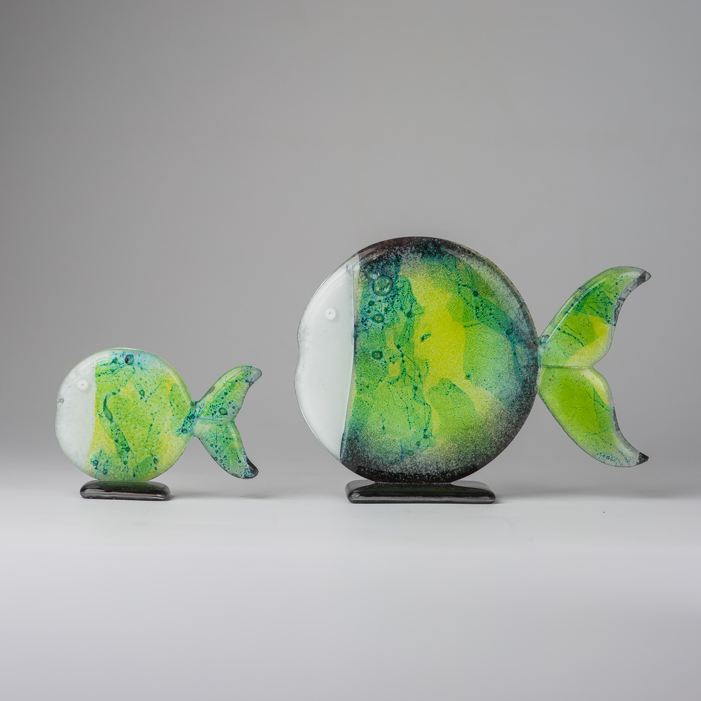 Figurka szklana przedstawiająca fantazyjną rybkę wykonana w technice wypieku w piecu w wysokich temperaturach ( fusing ). Barwiona powierzchniowo, proszkowo w kolorach zielonym przeplatanym z limonkowym i niebieskim. Czarna szklana podstawa. Piękna dekoracja domu, pomysł na zagospodarowanie półki, szafki czy parapetu. Wykonana ręcznie w małej autorskiej pracowni szkła w Krośnie. Produkt polski. Świetna na oryginalny , nietuzinkowy prezent. Możliwość skompletowania z innymi rybkami z serii mniejszymi lub w innych kolorach . Można też kompletować z figurkami z tej samej pracowni np. żabą czy statkiem. Rozmiar wys. 14 cm, szer. 22 cm, gł. 6 cm.