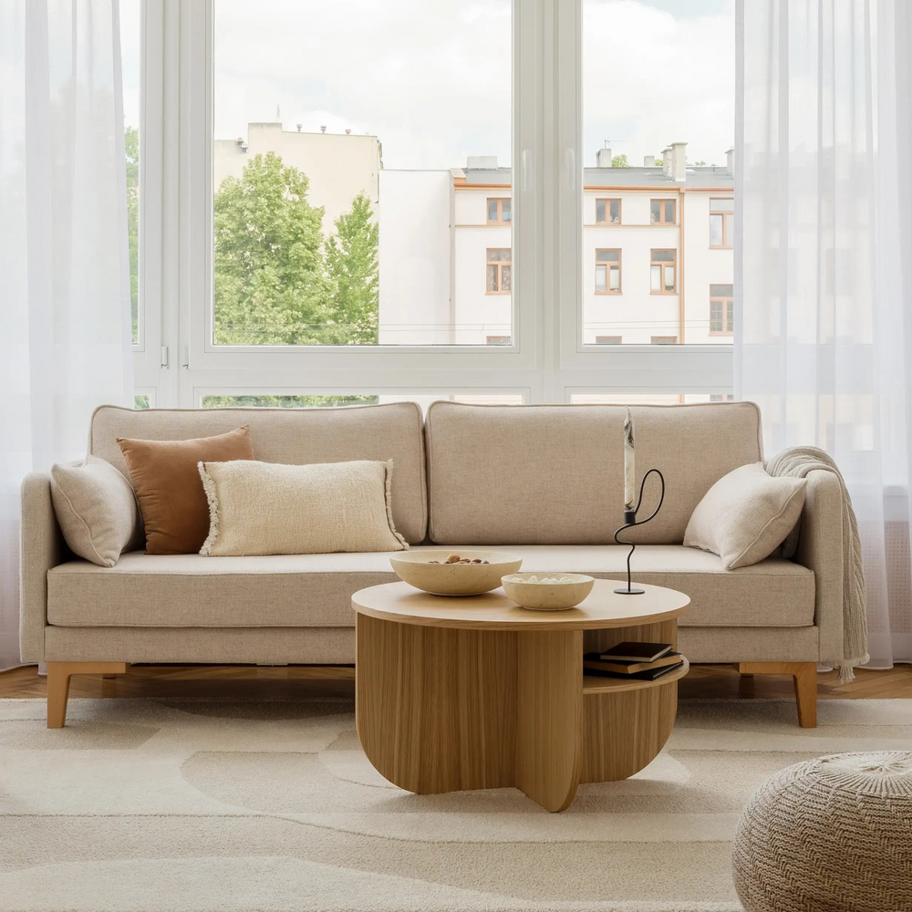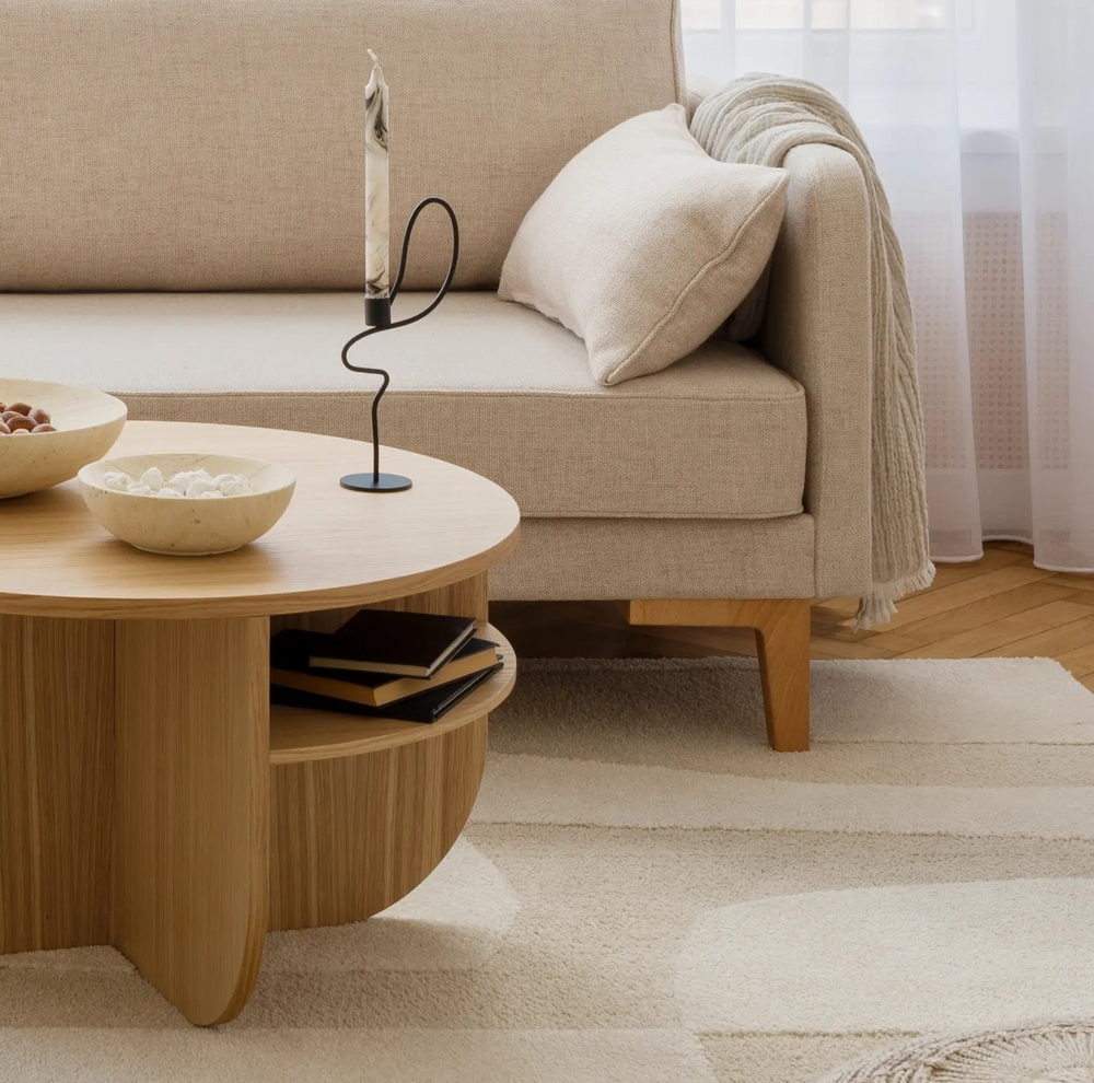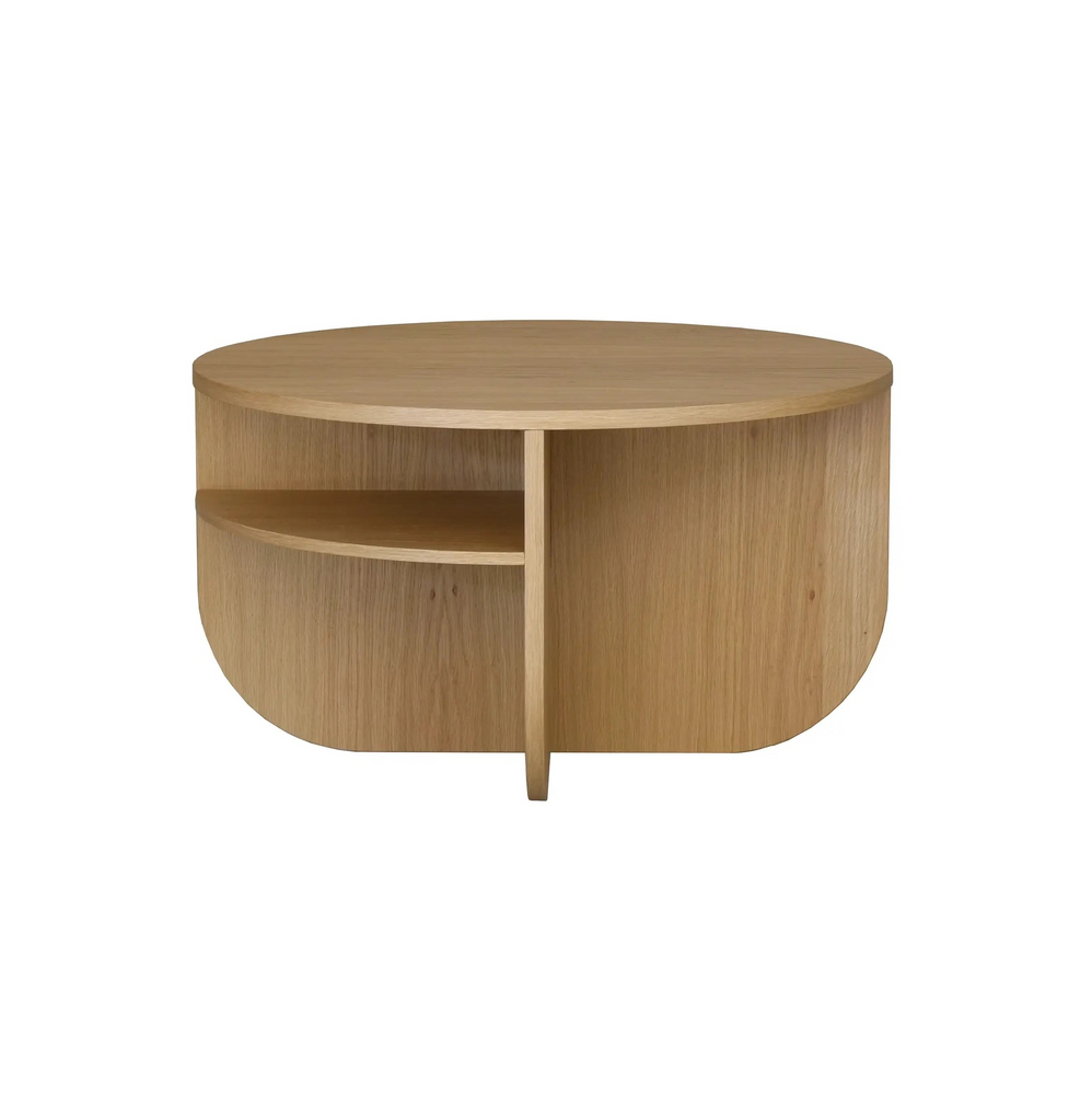 Stolik FINN podzielony został na 4 ćwiartki a pomiędzy dwiema umieszczona została praktyczna półka. To idealne praktyczne miejsce na piloty, tablet lub podkładki pod kubki.