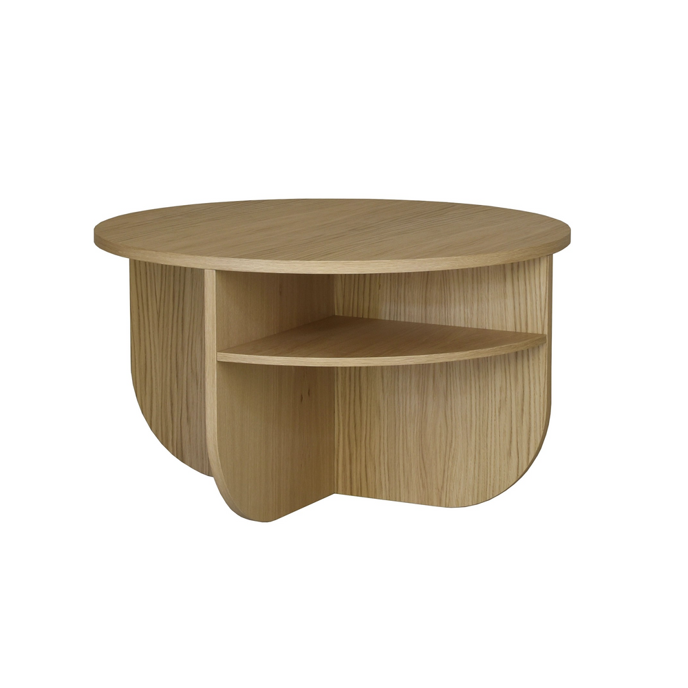 Oryginalny okrągły stolik z półką . Blat i podstawa wykonane z forniru dębu dodaje stolikowi elegancji oraz podkreśla jego naturalny przyjazny charakter. Stolik posiada finezyjny, miękki kształt