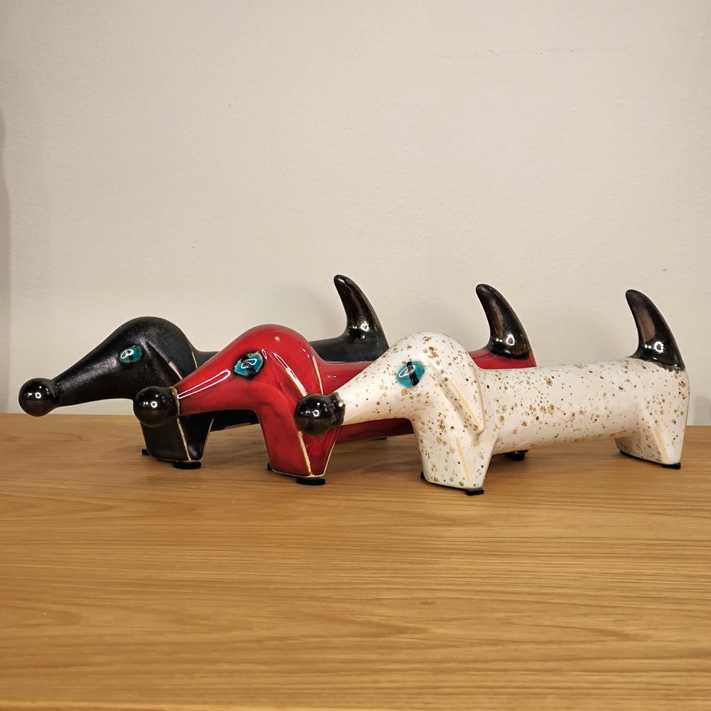Ceramiczna, oryginalna figurka przedstawiająca jamnika.  Kolorystyka szkliwo czarne matowe , nos metaliczny oko turkusowe . Wykonany ręcznie w małej pracowni ceramiki artystycznej w Polsce. Sprawdzi się jako prezent nie tylko dla miłośników psów tej rasy. Może stać się również ciekawą , niepowtarzalną dekoracja w domu. Możliwość zestawienia z innymi figurkami wykonanymi w tej technice lub pieskami z innych pracowni. Wielkość długość 22 cm, wysokość 8 cm , głębokość 5 cm.