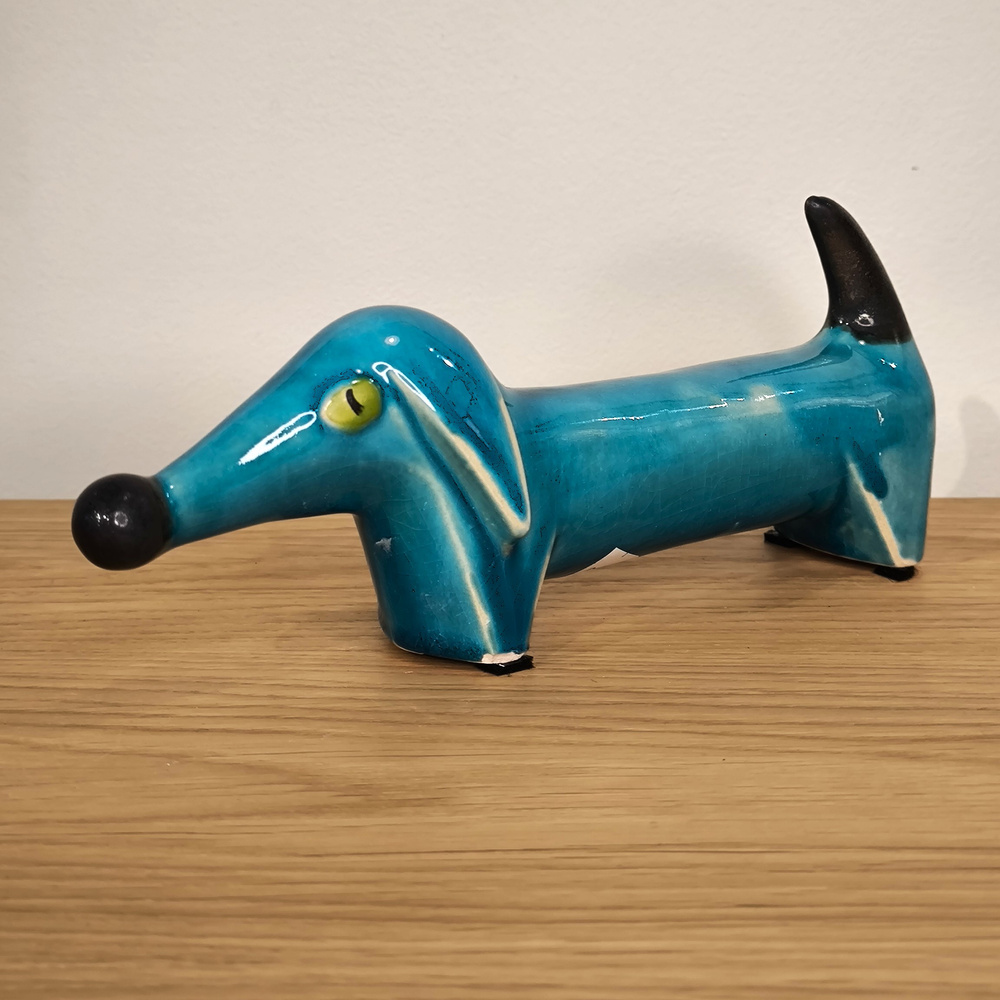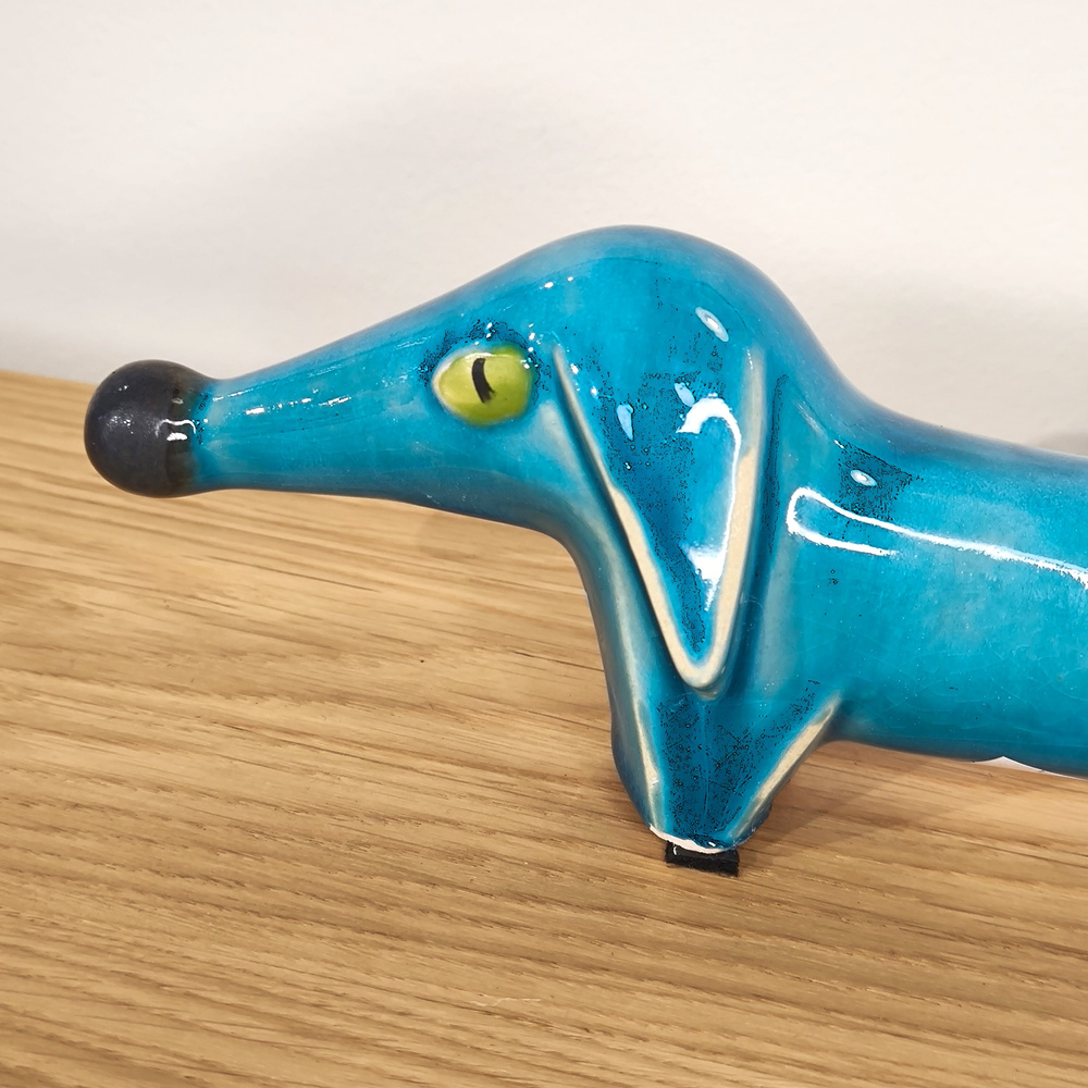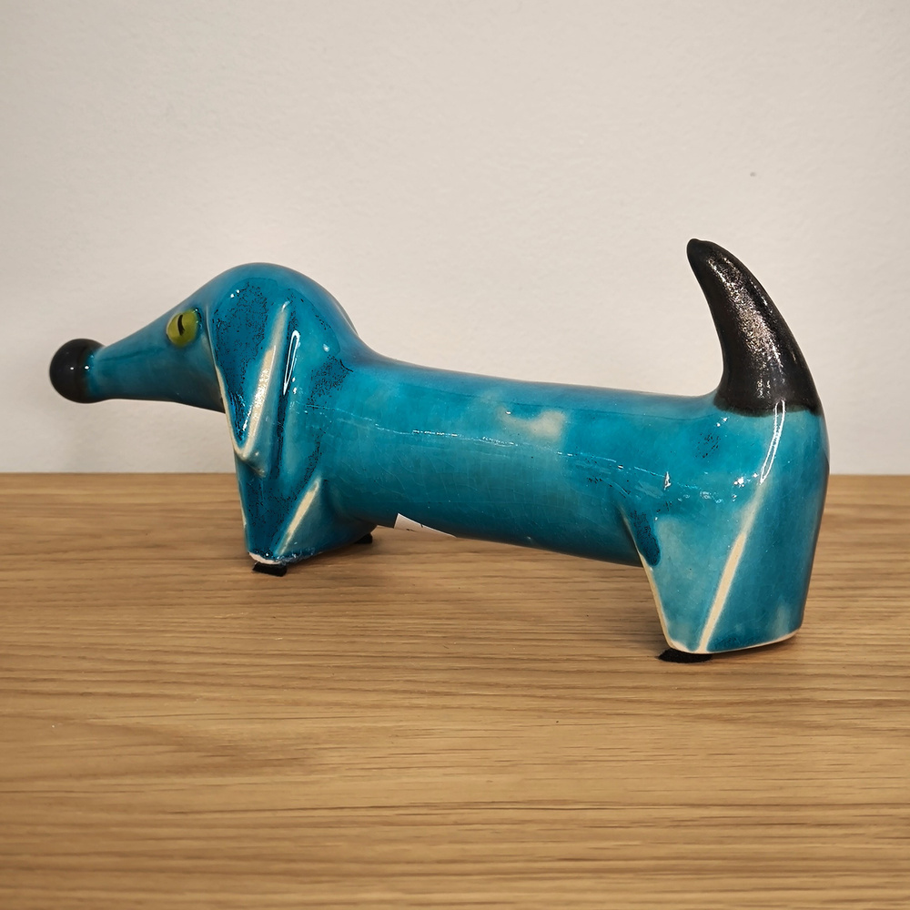 - Ceramiczna figurka- jamnik w kolorze lśniącym turkusowym.