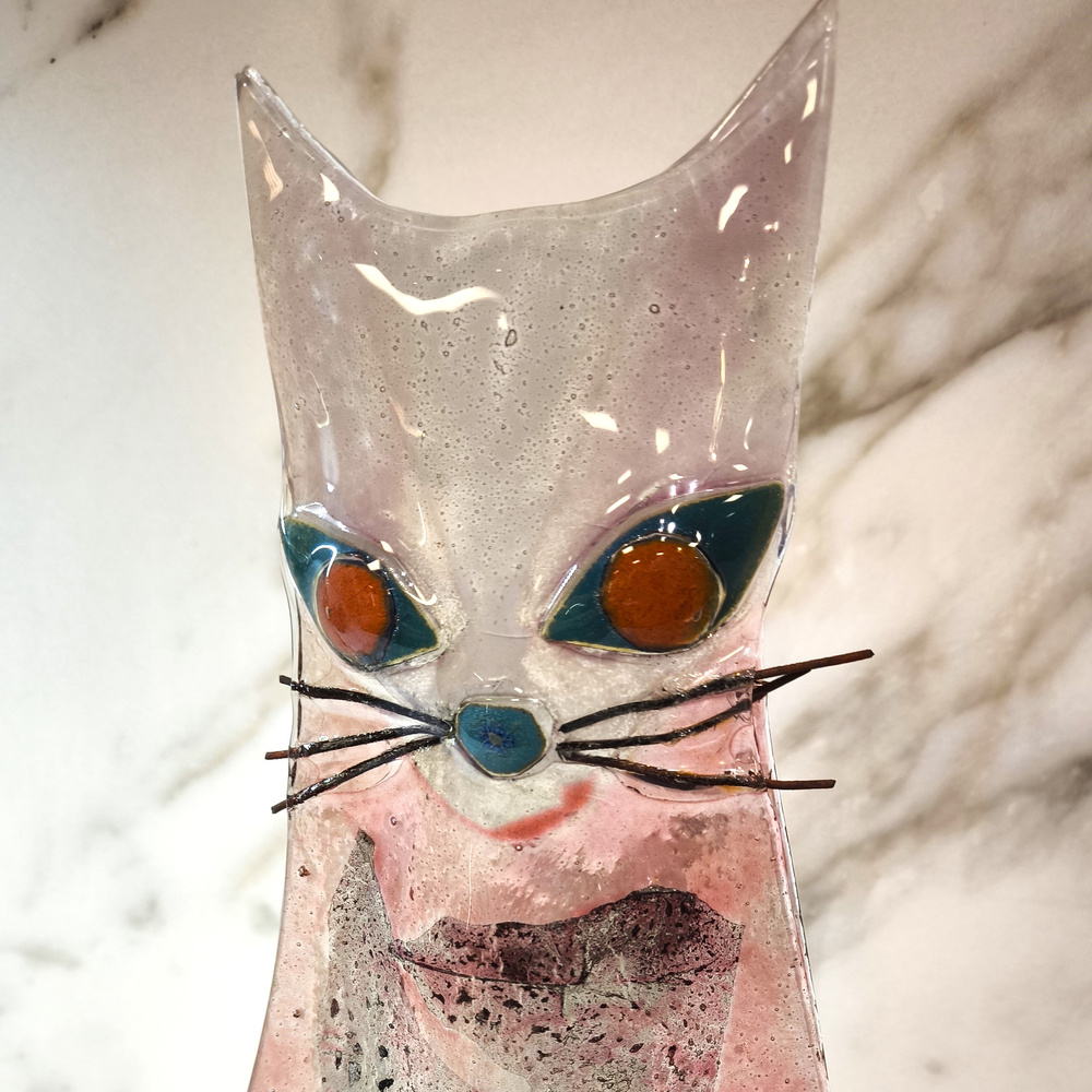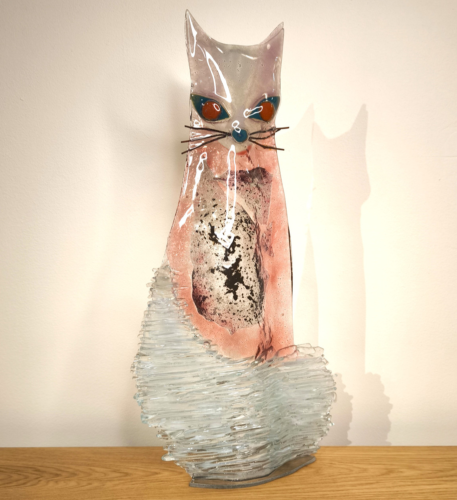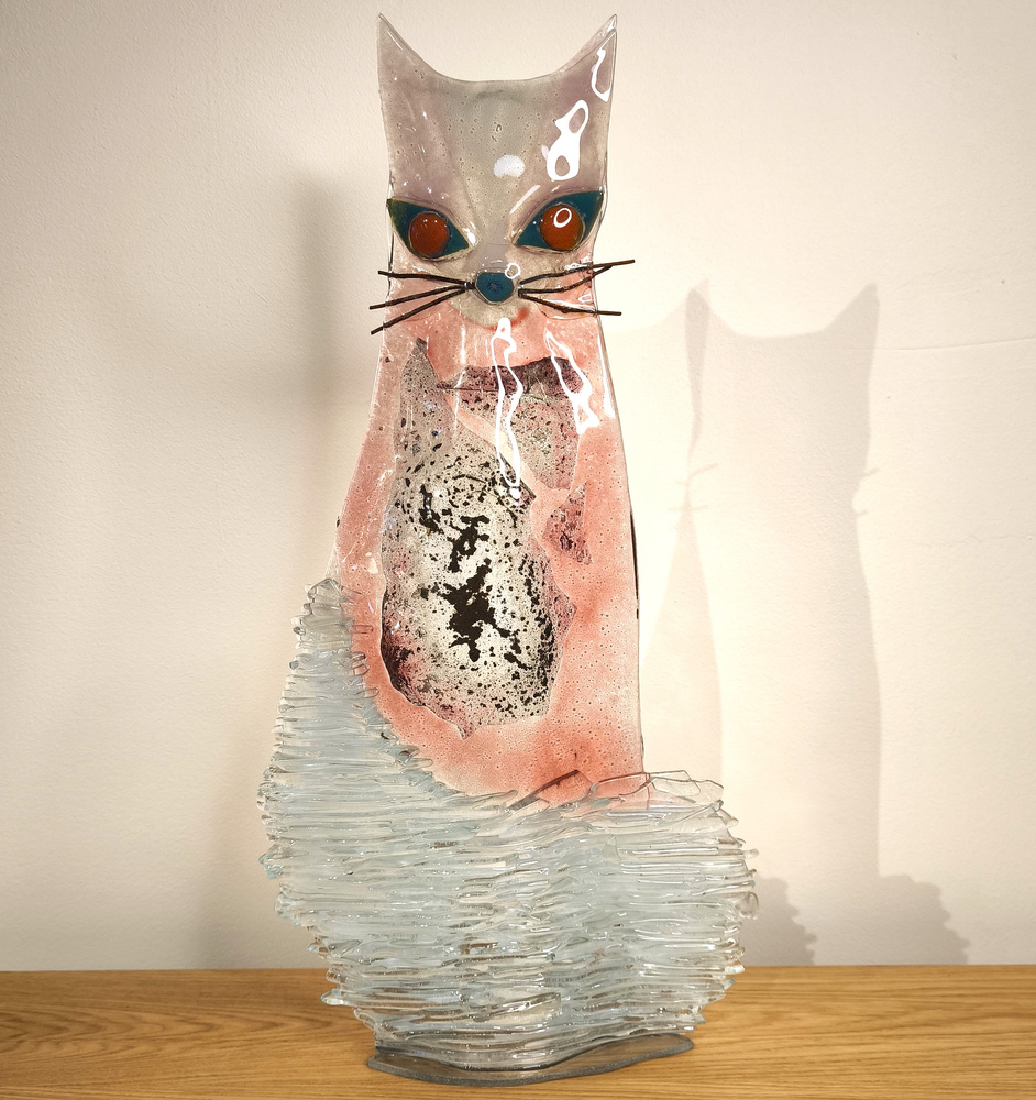 Praca jednostkowa, każdy kot jest inny, niepowtarzalny. Autorką jest Dominika Łoś wrocławska artystka, absolwentka Akademii Sztuk Pięknych . Figurka świetnie sprawdzi się jako prezent lub niepowtarzalna dekoracja domu czy mieszkania. Wykonana własnoręcznie przez autorkę , barwiona proszkami w kolorze różu, z odrobiną popielu i bieli. Wypalana w wysokich temperaturach w piecu, a następnie odprężona. Zawiera elementy metalowe zatopione w szkle najczęściej wąsy i elementy ogona , co nadaje pracy oryginalnego rysu artystycznego. Istnieją wersje kotów w innych kolorach i wielkościach. Wielkość około wys.45 cm, szer. 24 cm , gł. 9 cm.