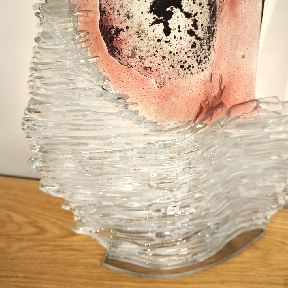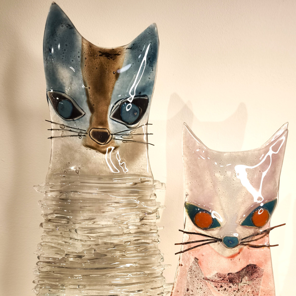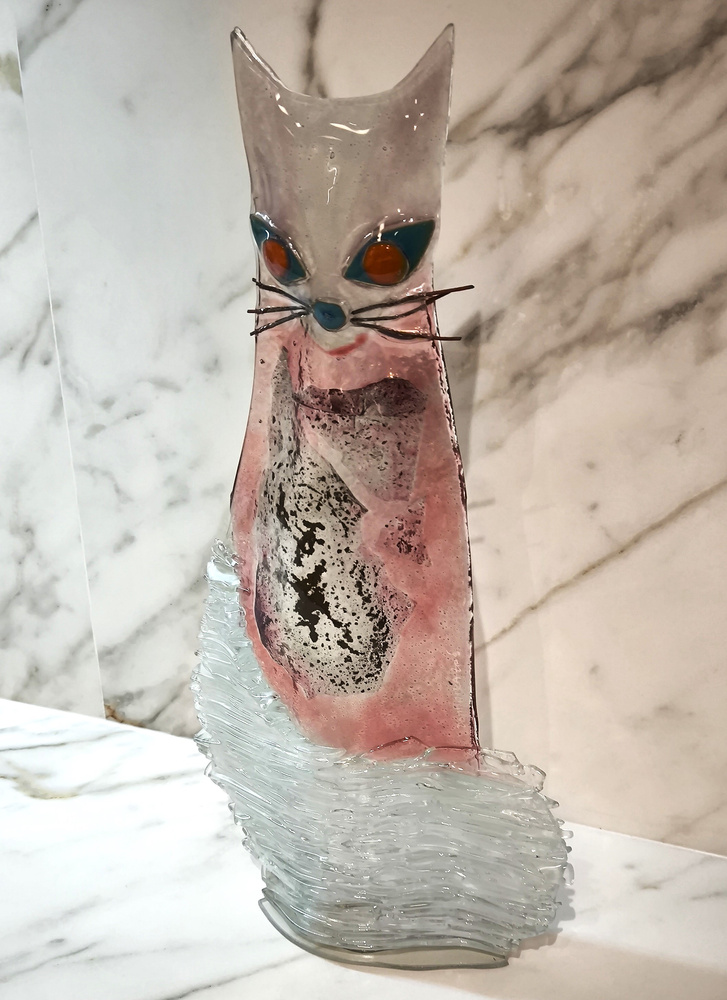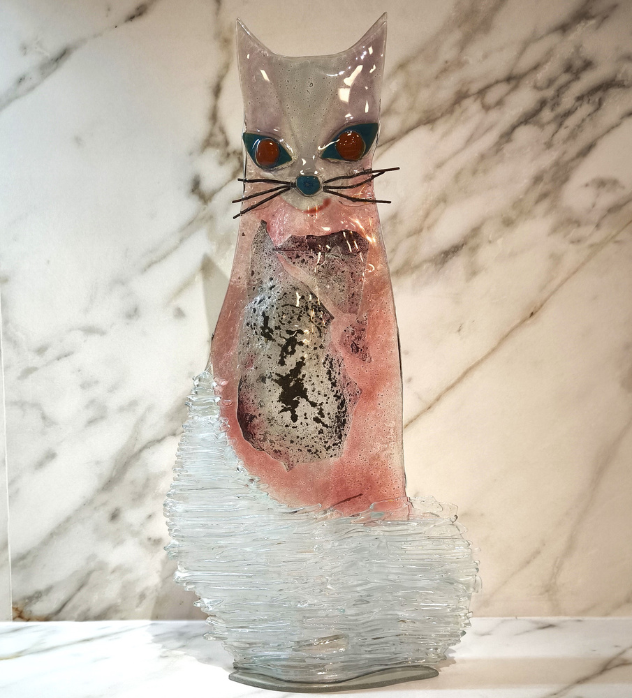Praca jednostkowa, każdy kot jest inny, niepowtarzalny. Autorką jest Dominika Łoś wrocławska artystka, absolwentka Akademii Sztuk Pięknych . Figurka świetnie sprawdzi się jako prezent lub niepowtarzalna dekoracja domu czy mieszkania. Wykonana własnoręcznie przez autorkę , barwiona proszkami w kolorze różu, z odrobiną popielu i bieli. Wypalana w wysokich temperaturach w piecu, a następnie odprężona. Zawiera elementy metalowe zatopione w szkle najczęściej wąsy i elementy ogona , co nadaje pracy oryginalnego rysu artystycznego. Istnieją wersje kotów w innych kolorach i wielkościach. Wielkość około wys.45 cm, szer. 24 cm , gł. 9 cm.