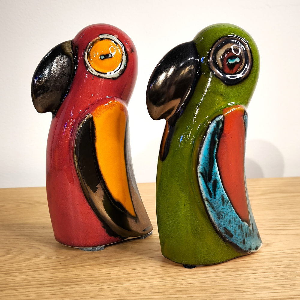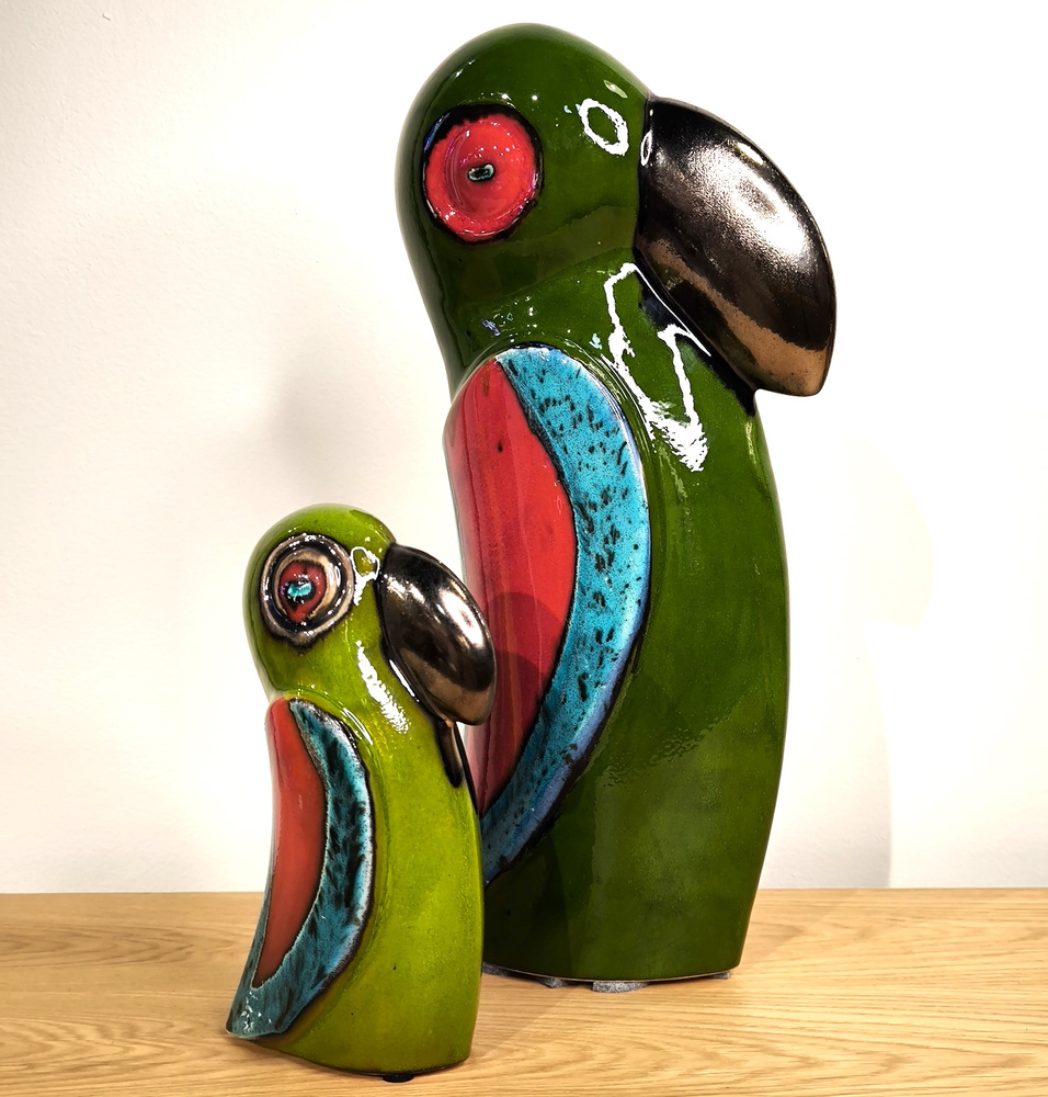 - Ceramiczna szkliwiona na zielono z dodatkiem czerwieni i niebieskiego , metaliczny kolor dziobu papugi. Wykonana ręcznie. Minimalistyczna forma.