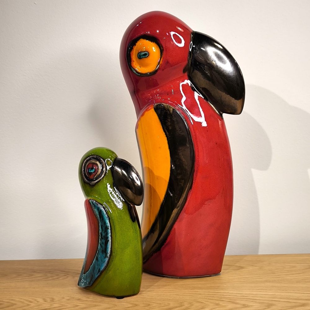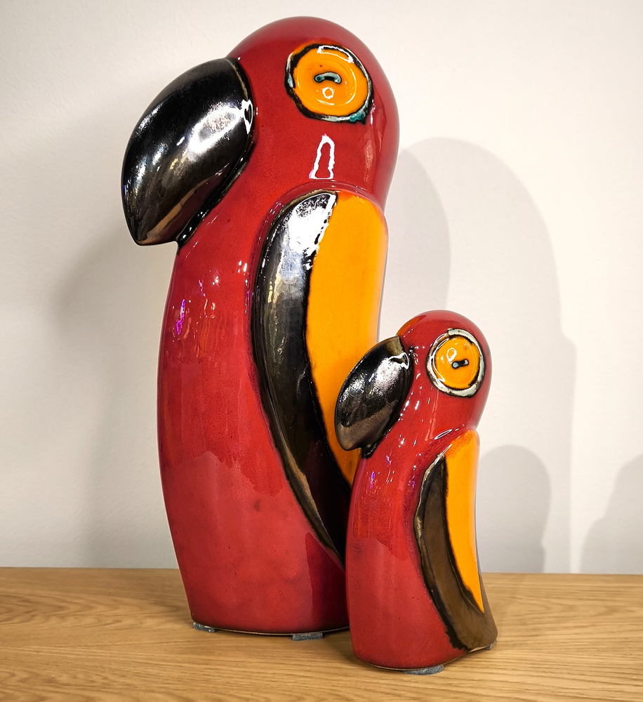 - Ceramiczna szkliwiona na czerwono z dodatkiem pomarańczu ,metaliczny kolor dziobu i skrzydła papugi. Wykonana ręcznie. Minimalistyczna forma.
