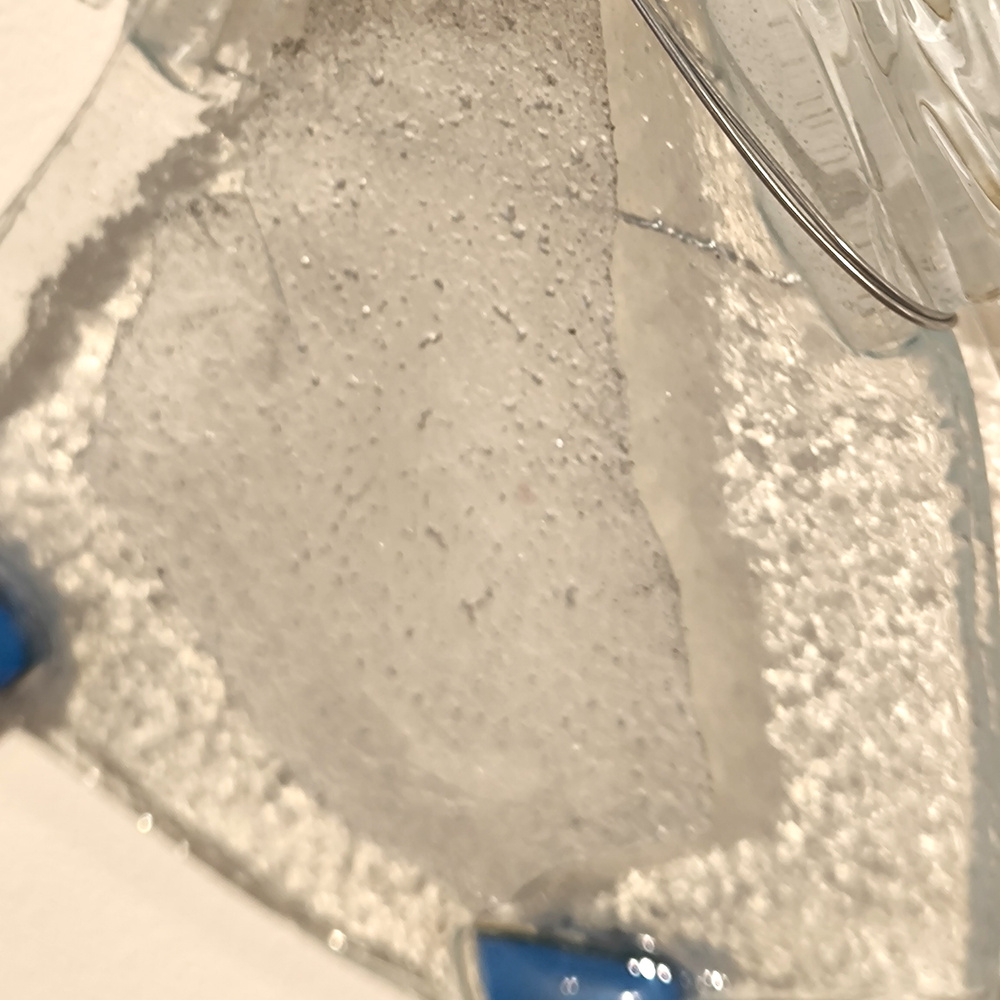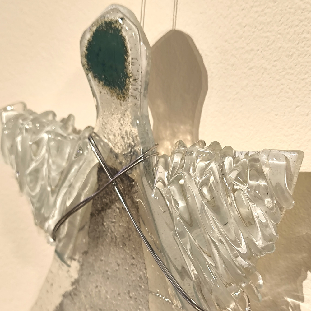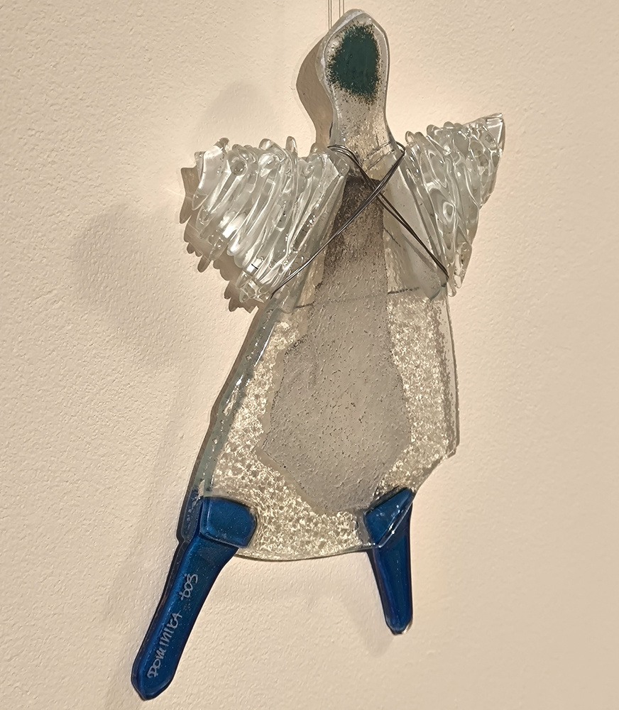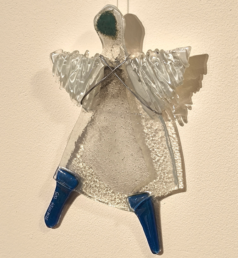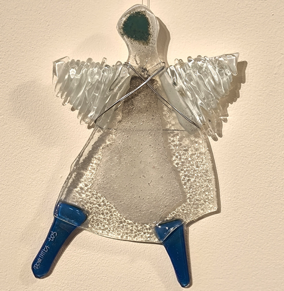 - Szklana figurka wisząca przedstawiająca anioła, wykonana ze szkła fusingowego. Kolorystyka przezroczysty z niebeskimi nogami.