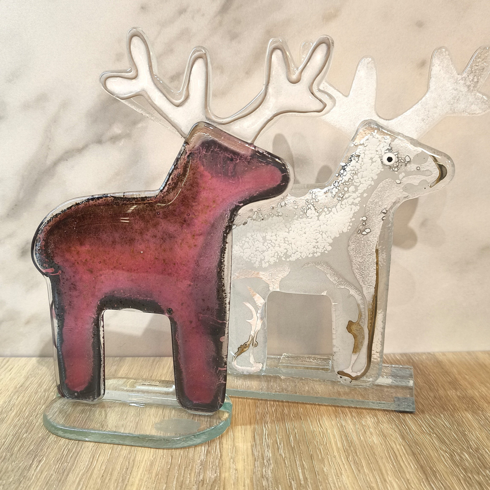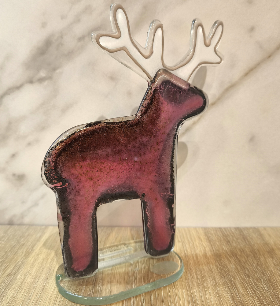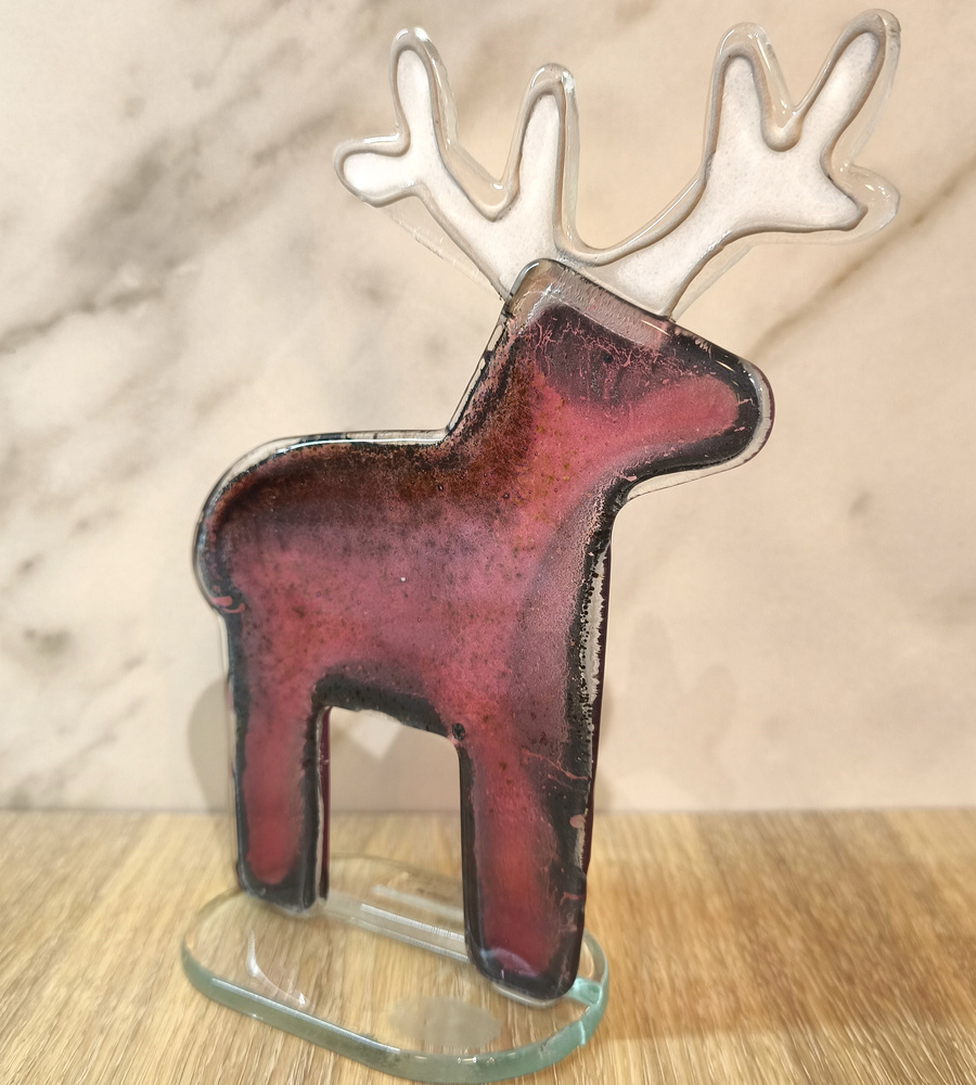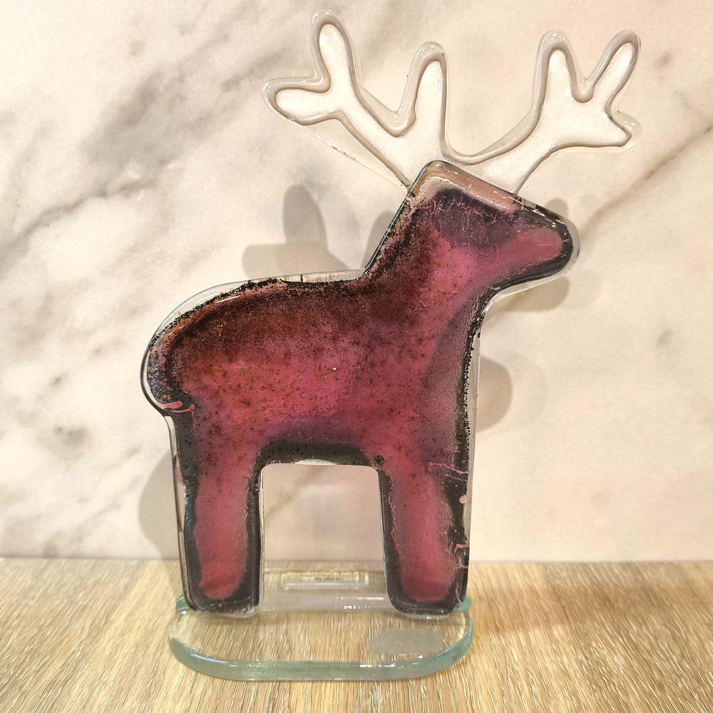Unikatowa figurka szklana przedstawiająca reniferka w różowo-fioletowej kolorystyce z białym porożem i przeżroczystą podstawą. Wykonana przez artystkę w technice fiusingu . Piękna dekoracja domu lub mieszkania, zwłaszcza w okresie zimowo świątecznym. Idealna na unikatowy, niebanalny prezent. Pięknie komponuje się z innym figurkami w świątecznym klimacie np. bałwankiem aniołkiem czy choinką. Występuje również w innym kolorze np. białym . Wielkość szer. 16 cm, wys. 20 cm, gł. 7 cm.
