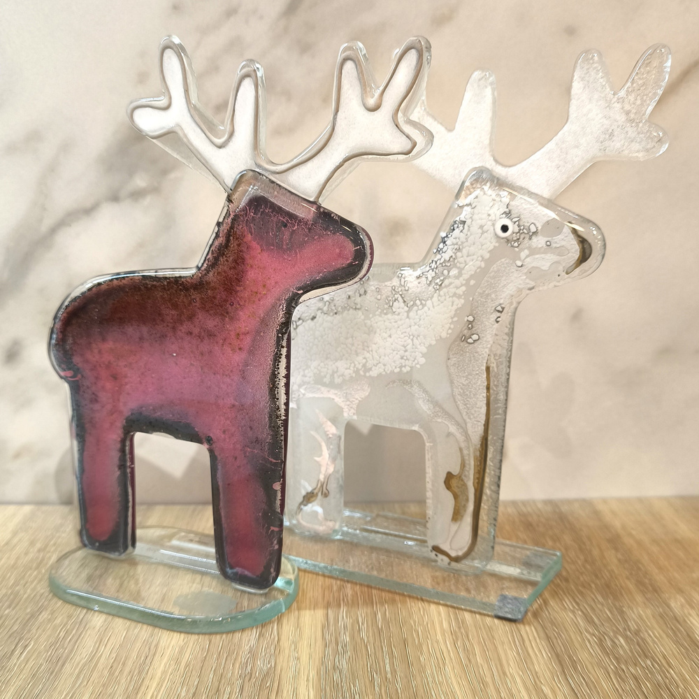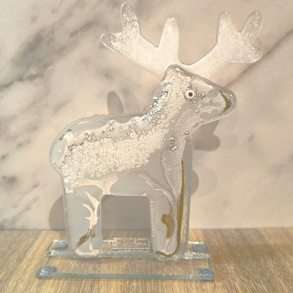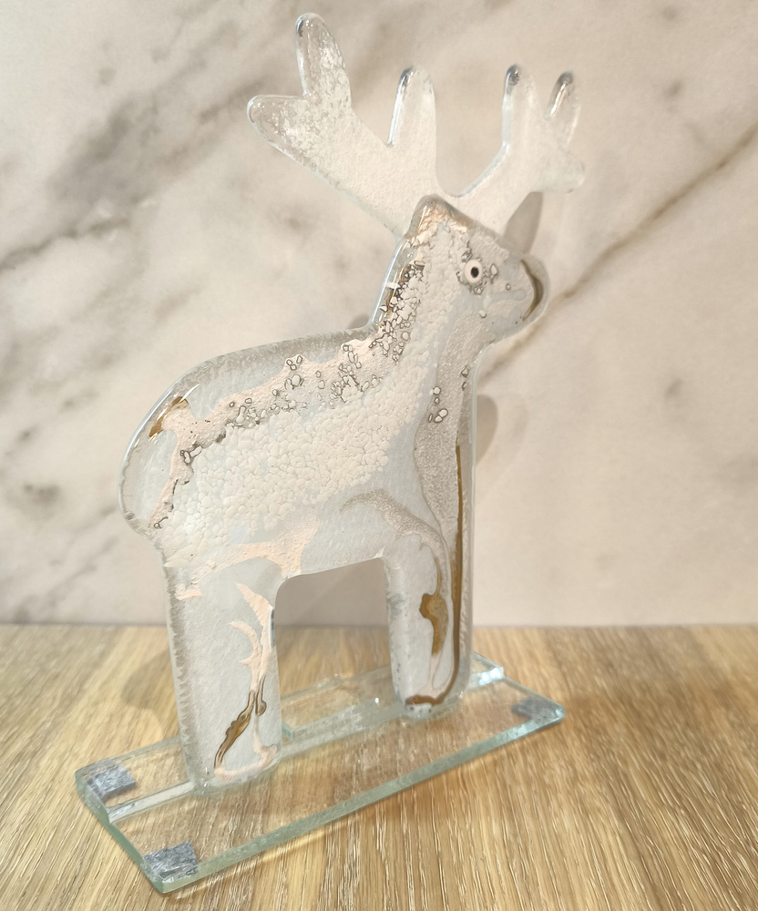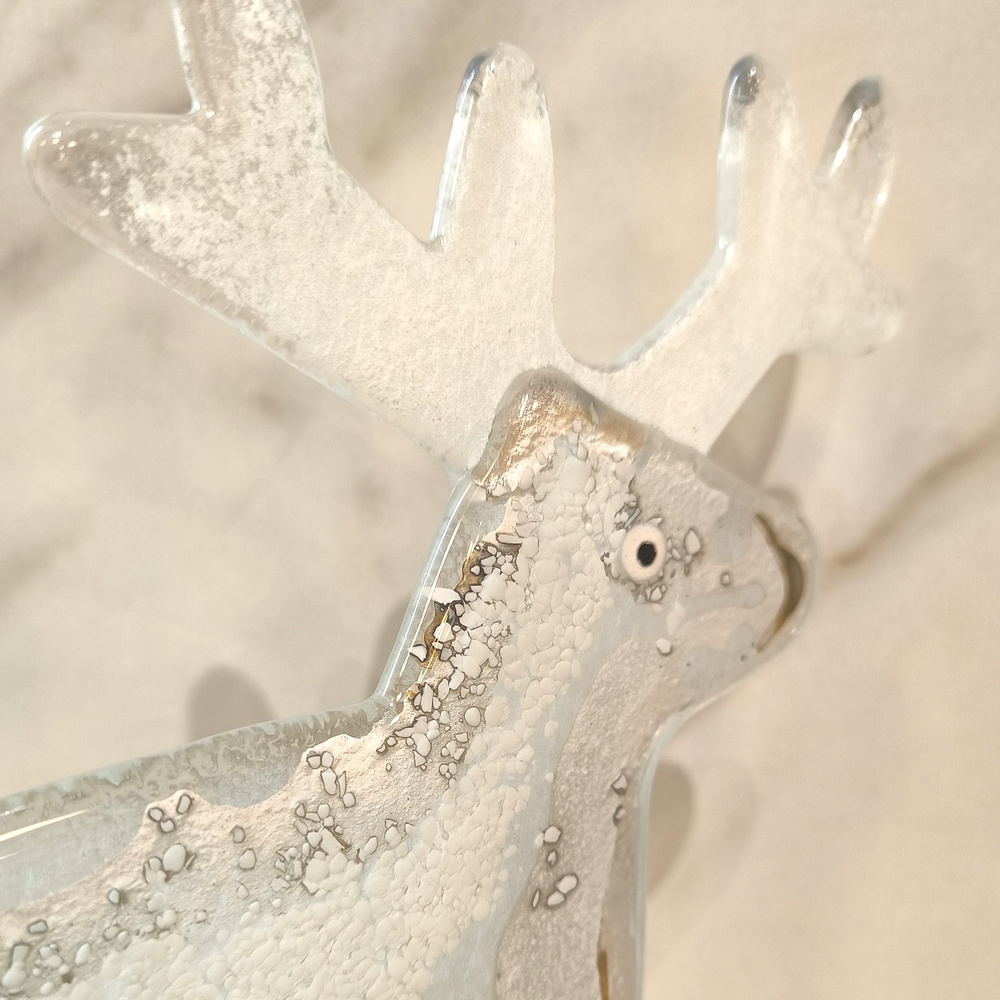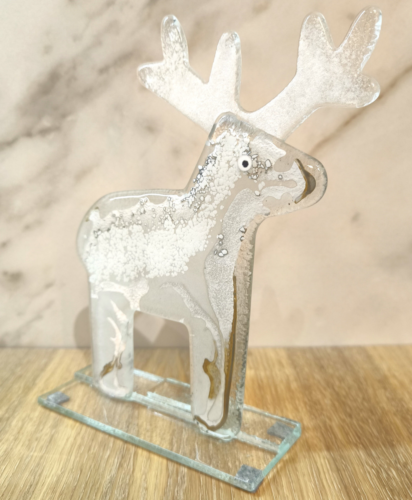 Unikatowa figurka szklana przedstawiająca reniferka w biało-szarej kolorystyce z białym porożem i przeżroczystą podstawą. Wykonana przez artystkę w technice fiusingu . Piękna dekoracja domu lub mieszkania, zwłaszcza w okresie zimowo świątecznym. Idealna na unikatowy, niebanalny prezent. Pięknie komponuje się z innym figurkami w świątecznym klimacie np. bałwankiem aniołkiem czy choinką. Występuje również w innym kolorze np. białym . Wielkość szer. 16 cm, wys. 20 cm, gł. 7 cm.