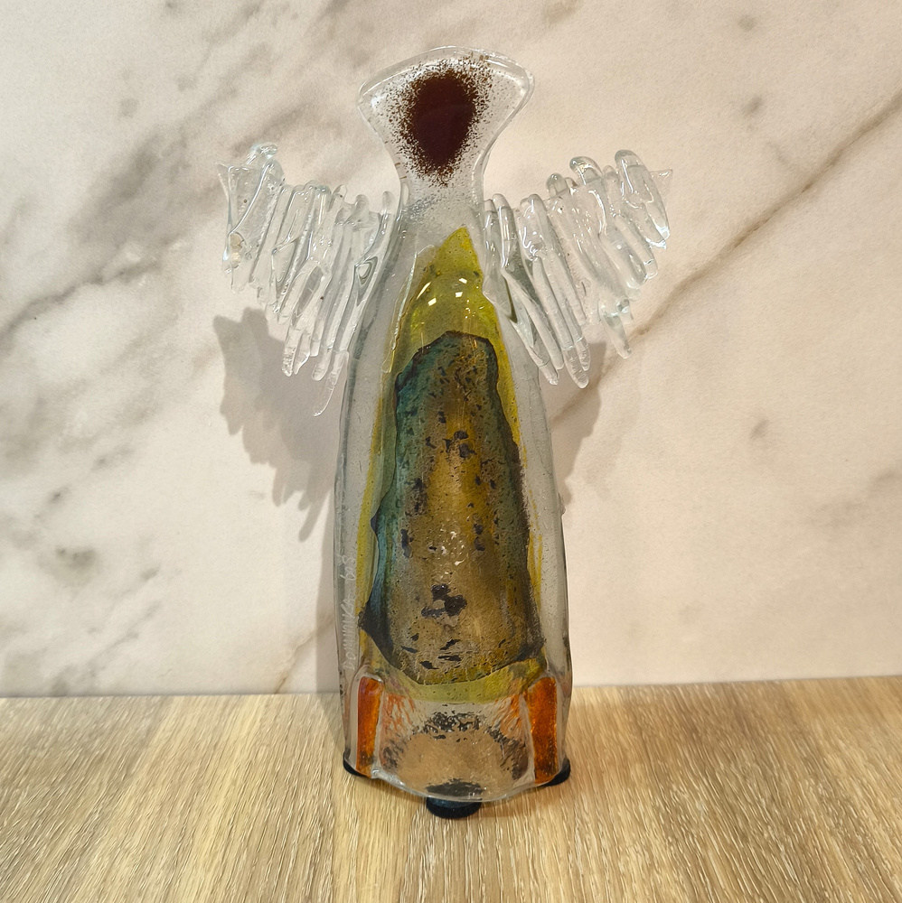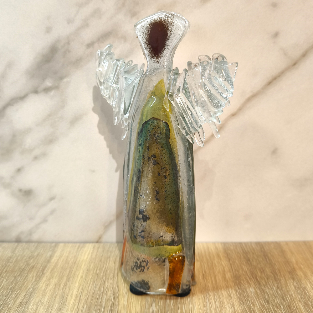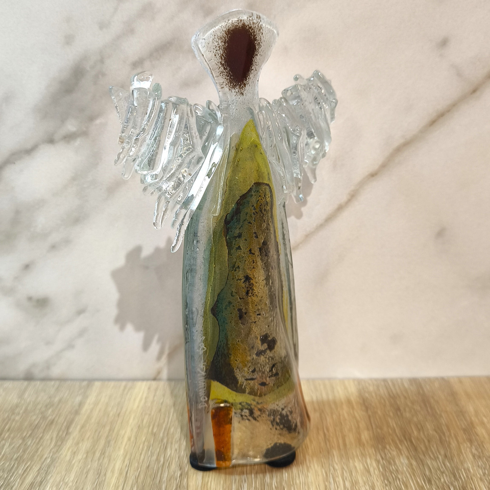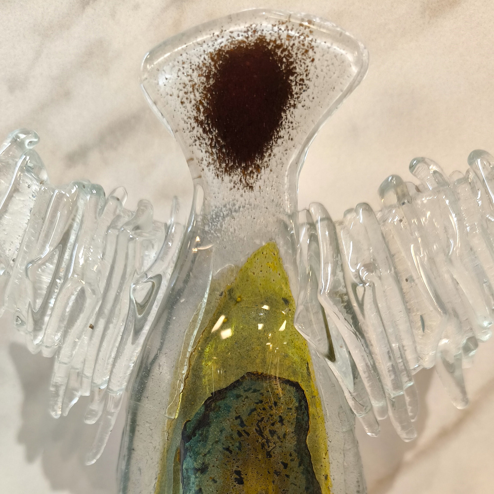 - Szklana unikatowa figurka przedstawiająca anioła, wykonana ze szkła fusingowego. Kolorystyka wielobarwna, transparentne szkrzydła.
