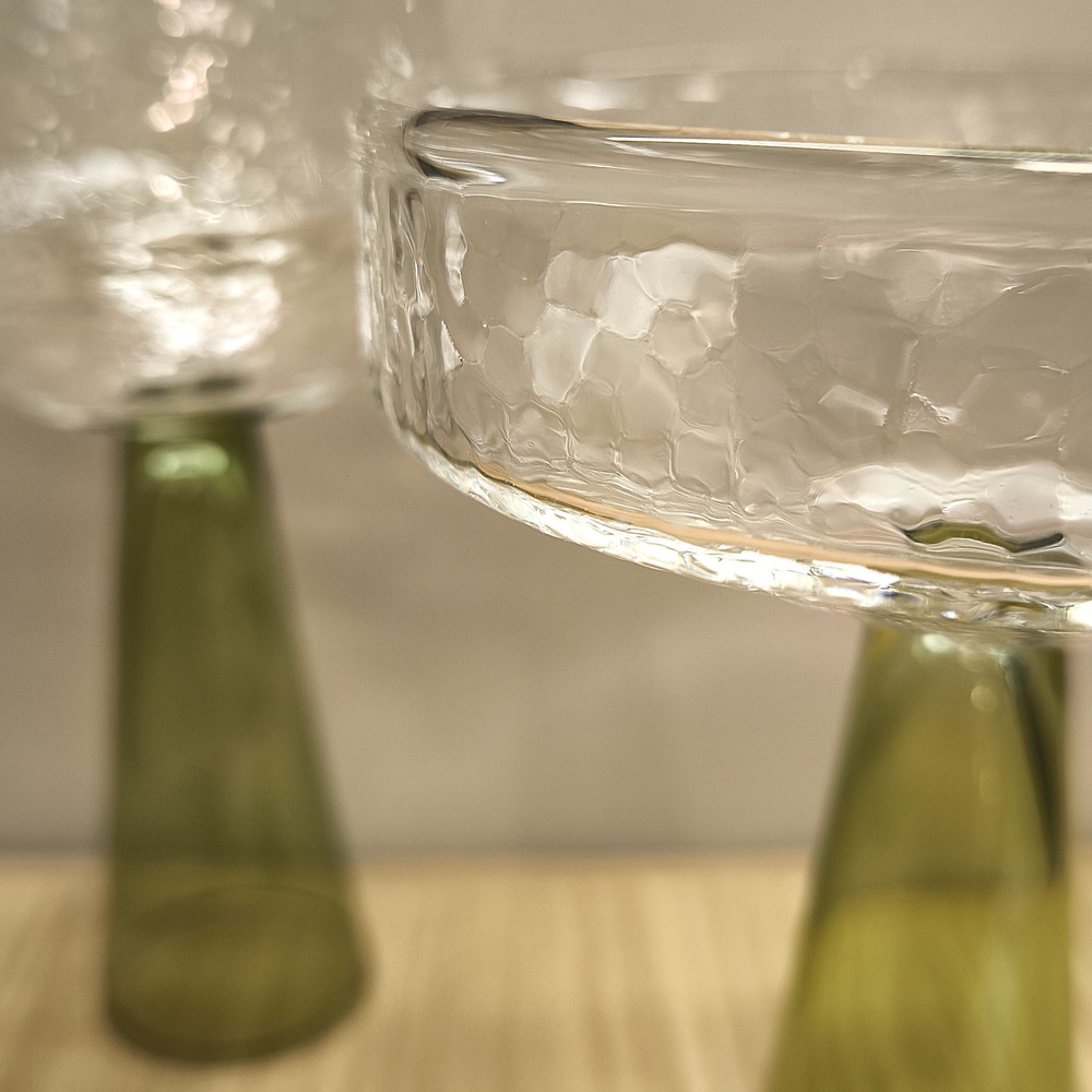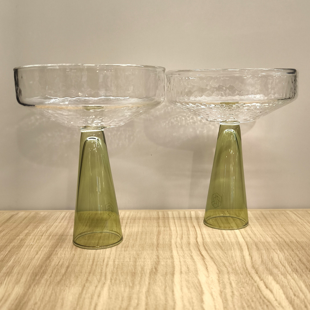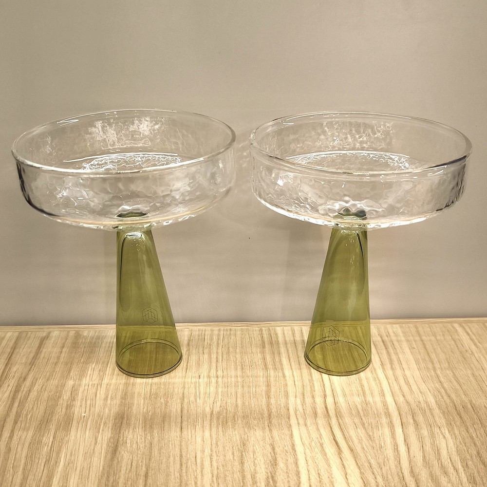 - Komplet 2 kieliszków do szampana i wina musującego. Wykonane ręcznie z wysokiej jakości szkła boro-krzemianowego. Wymiary: 13/10 cm. Nóżka kolor zielony , czarka bezbarwna mrożona.