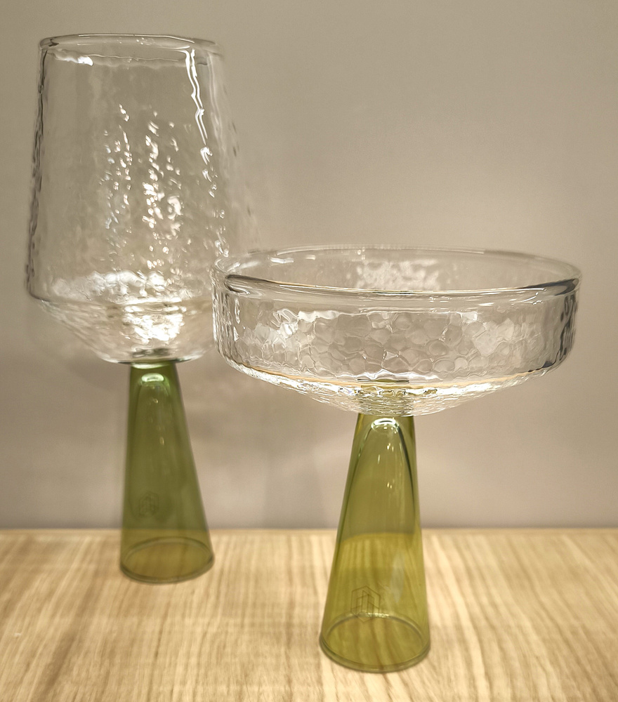 Komplet 2 kieliszków do wina wykonanych ręcznie z wysokiej jakości szkła boro-krzemianowego. Nóżka kolor zielony, czarka bezbarwna z efektem mrożenia. Występują też w wersji kolorystycznej z żółtą lub różową nóżką lub jako kieliszki do wina.