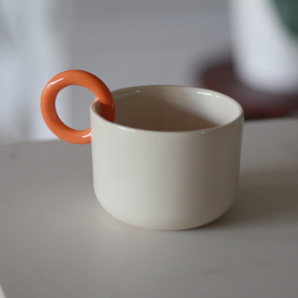 • Ręcznie robiona filiżanka z oryginalnym uchwytem w kolorze pomarańczowym. Wykonana z kamionki i wypalona w 1200 o C.