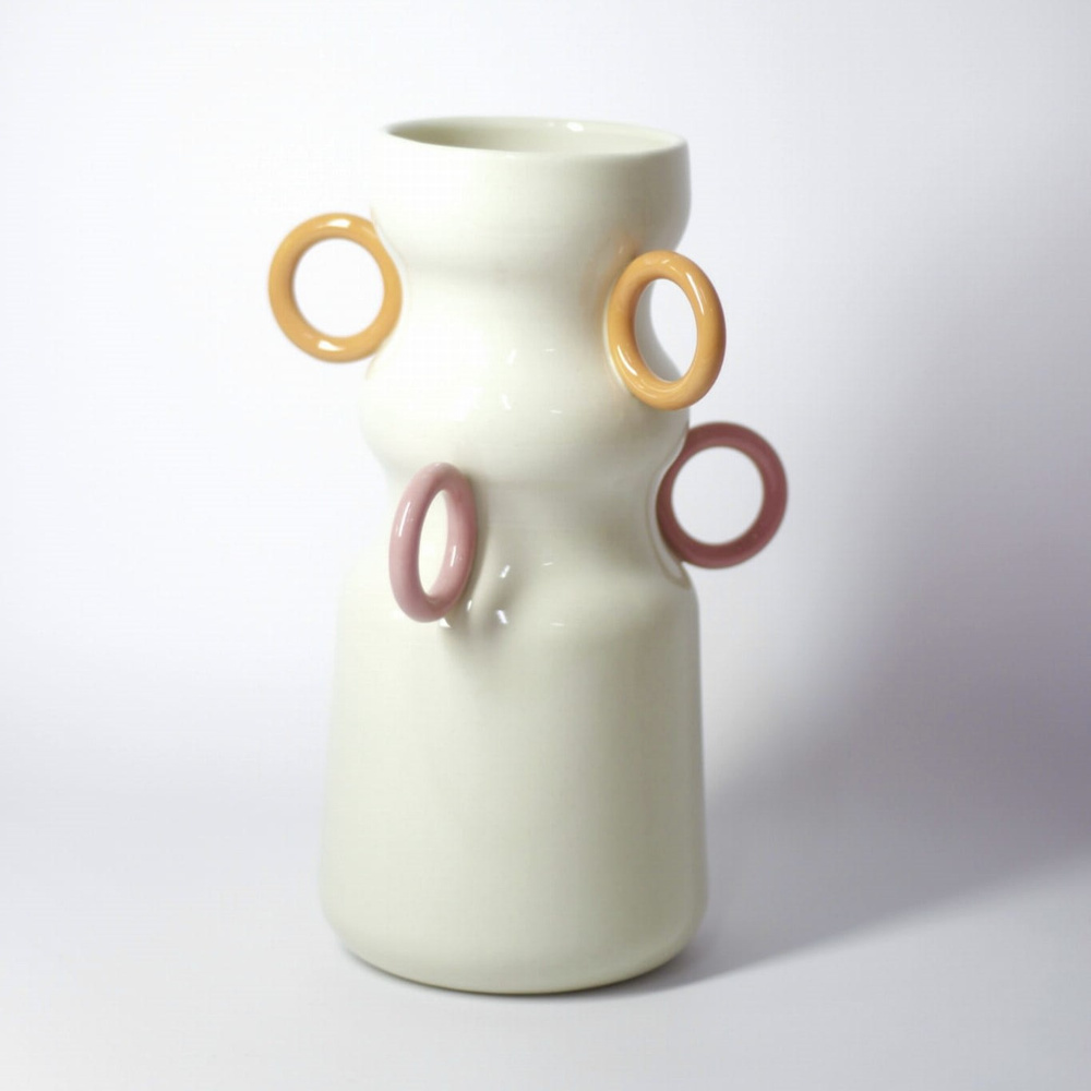 - Wazon Twist w kolorze białym z żółto-fioletowymi uszkami kółkami.