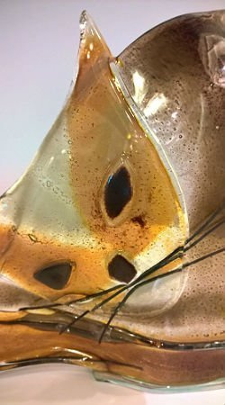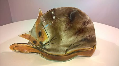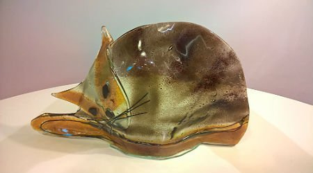 - Szklana figurka przedstawiająca zwiniętego w kłębek kota. Wykonana w technice fusingu. Kolorystyka kolory ziemi, pomarańcze i brązy. Wąsy druciane, grawerowane oczy i bużka. Praca unikatowa.