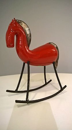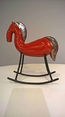 - Figurka ceramiczna - konik na metalowych biegunach. Kolor czerwony z metalicznym dodatkiem na grzebieniu i ogonie, bieguny czarne.